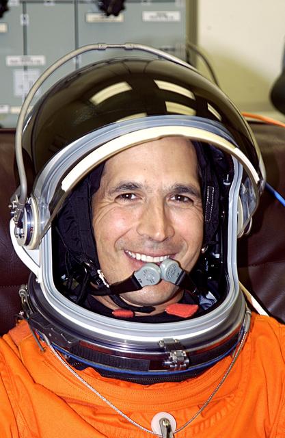 KENNEDY SPACE CENTER, FLA. -- - STS-113 Mission Specialist John Herrington smiles as he finishes suiting up for a second launch attempt on mission STS-113. The launch on Nov. 22 was scrubbed due to poor weather conditions at the Transoceanic Abort Landing sites. Herrington will be making his first Shuttle flight. The launch will carry the Expedition 6 crew to the Station and return the Expedition 5 crew to Earth. The major objective of the mission is delivery of the Port 1 (P1) Integrated Truss Assembly, which will be attached to the port side of the S0 truss. Three spacewalks are planned to install and activate the truss and its associated equipment. Launch of Space Shuttle Endeavour on mission STS-113 is now scheduled for Nov. 23 at 7:50 p.m. EST.