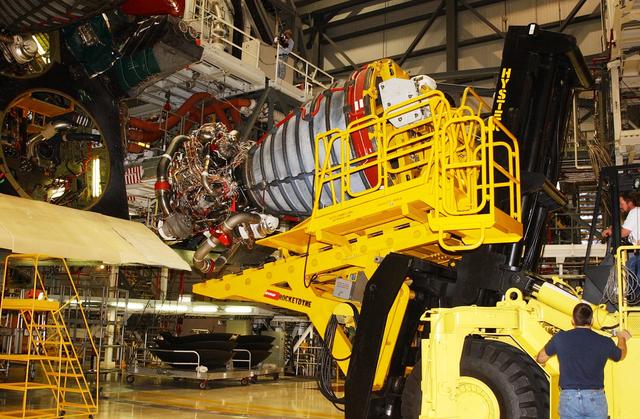 KENNEDY SPACE CENTER, FLA. -- In the Orbiter Processing Facility, an orbiter main engine is lifted by a new engine hyster, built by Rocketdyne, that is used to remove it from the orbiter. .