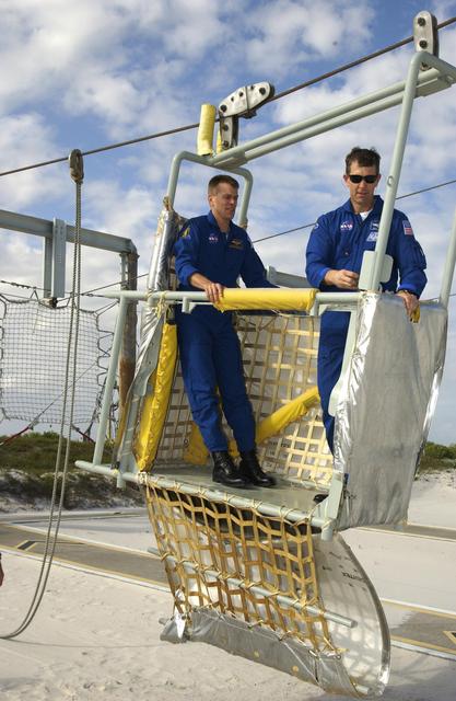 KENNEDY SPACE CENTER, FLA. -- During emergency egress training, part of Terminal Countdown Demonstration Test activities at the pad, STS-107 Pilot William "Willie" McCool and Commander Rick Husband share a slidewire basket. The TCDT also includes a simulated launch countdown. STS-107 is a mission devoted to research and will include more than 80 experiments that will study Earth and space science, advanced technology development, and astronaut health and safety. Launch is planned for Jan. 16, 2003, between 10 a.m. and 2 p.m. EST aboard Space Shuttle Columbia. .
