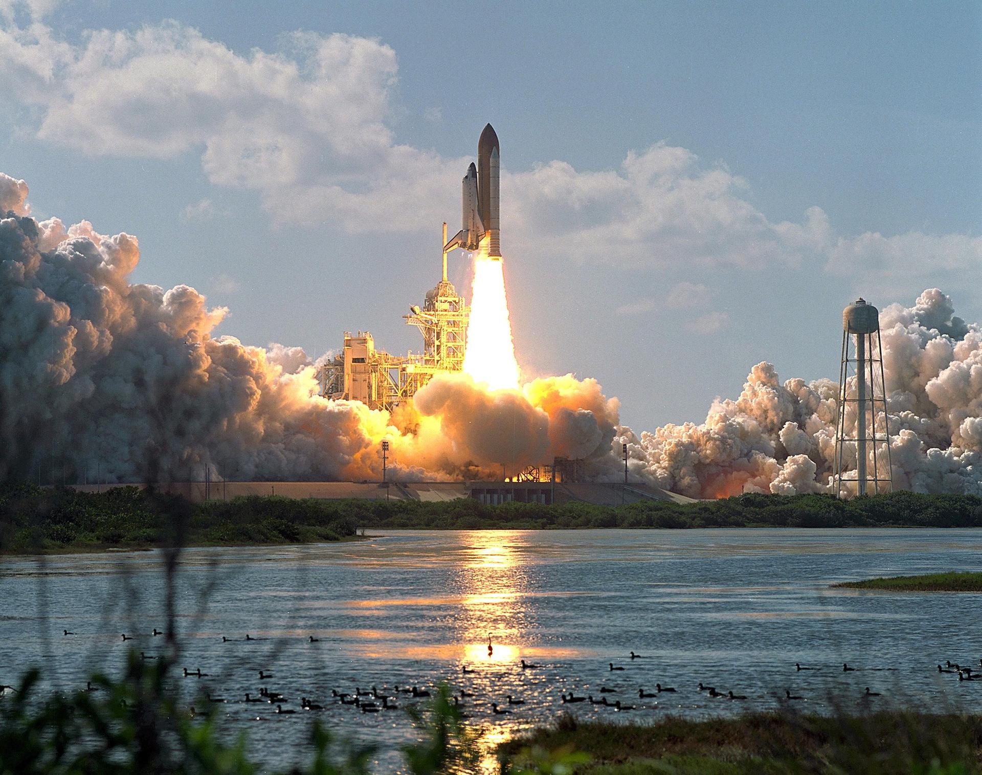 KENNEDY SPACE CENTER, FLA. -- Launch! Birds in the foreground seem oblivious to the fire and smoke as Space Shuttle Atlantis roars into the sky on mission STS-110. Liftoff occurred at 4:44:19 p.m. EDT (20:41:19 GMT). Carrying the S0 Integrated Truss Structure and Mobile Transporter, STS-110 is the 13th assembly flight to the International Space Station