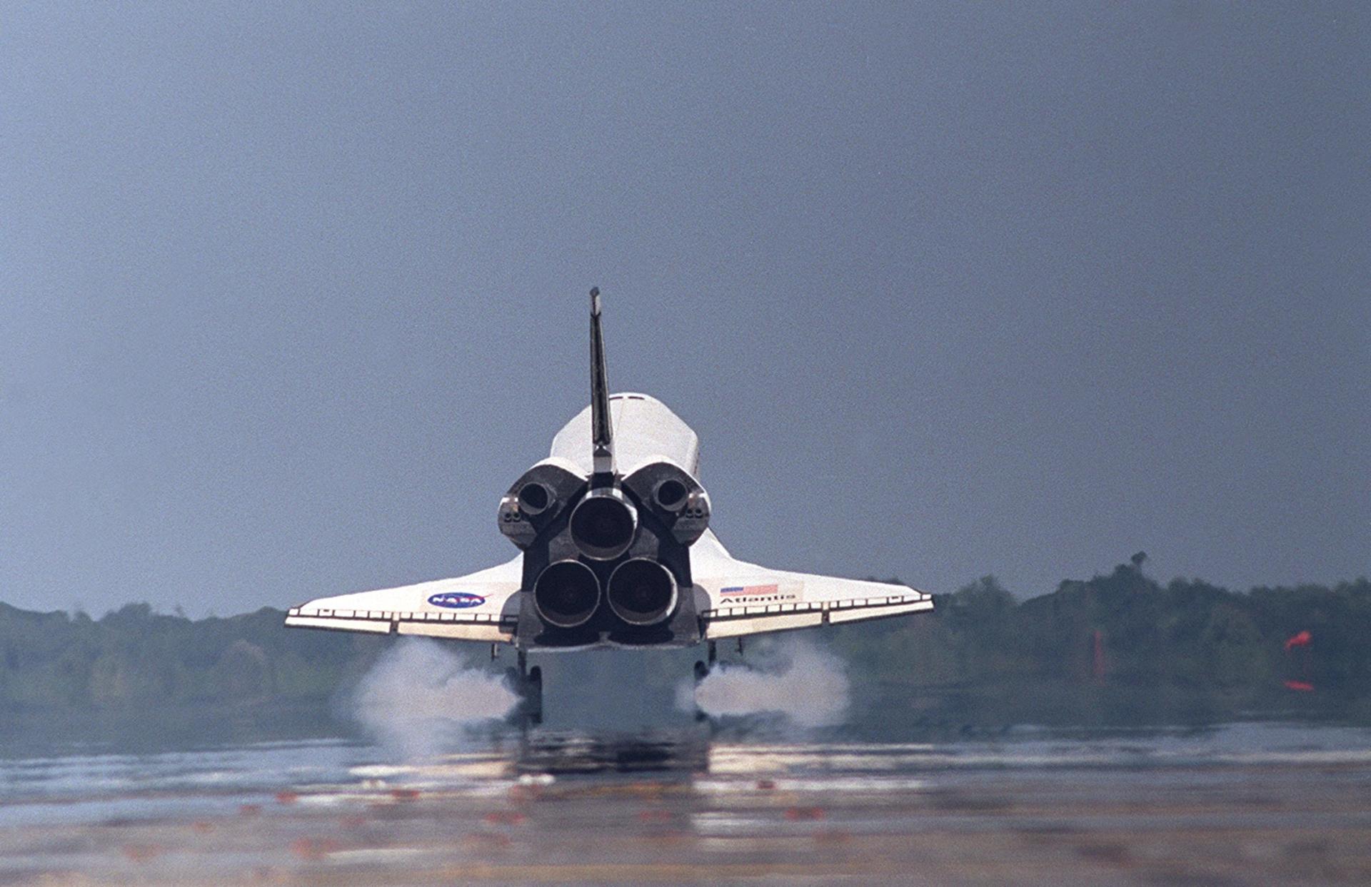 KENNEDY SPACE CENTER, FLA. - Atlantis kicks up dust as it touches down on runway 33 at the KSC Shuttle Landing Facility after completing its 11-day mission to the International Space Station. Aboard is the STS-112 crew comprising Commander Jeffrey Ashby, Pilot Pamela Melroy and Mission Specialists David Wolf, Sandra Magnus, Piers Sellers and Fyodor Yurchikhin. Main gear touchdown occurred at 11:43:40 a.m. EDT; nose gear touchdown at 11:43:48 a.m.; and wheel stop at 11:44:35 a.m. Mission elapsed time was 10:19:58:44. STS-112 expanded the size of the Station with the addition of the S1 truss segment. This was the 60th landing at KSC in the history of the Shuttle program.