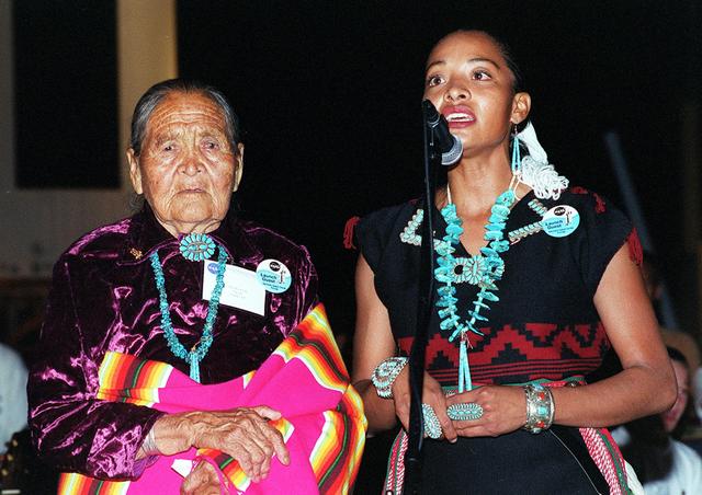KENNEDY SPACE CENTER, FLA. -- During a pre-launch Native American ceremony, Radmilla Cody (right) , the 2001 Miss Navaho Nation, sings the "Star Spangled Banner" in her native language. With her is her grandmother. The ceremony was part of several days' activities commemorating John B. Herrington as the first tribally enrolled Native American astronaut to fly on a Shuttle mission. Herrington is a Mission Specialist on STS-113.
