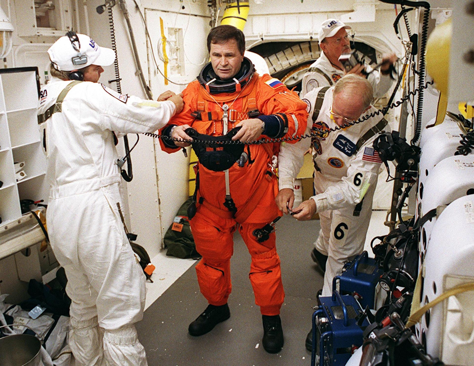 KENNEDY SPACE CENTER, FLA. -- In the White Room on Launch Pad 39A, Expedition 6 flight engineer Nikolai Budarin is helped with his launch and entry suit before entering Space Shuttle Endeavour. Closeout Crew members helping are (left) Rene Arriens, United Space Alliance mechanical technician, (right) Danny Wyatt, NASA Quality Assurance specialist, and (background) Rick Welty, United Space Alliance Vehicle Closeout chief. The launch will carry the Expedition 6 crew to the Station and return the Expedition 5 crew to Earth. The major objective of the mission is delivery of the Port 1 (P1) Integrated Truss Assembly, which will be attached to the port side of the S0 truss. Three spacewalks are planned to install and activate the truss and its associated equipment. Launch of Space Shuttle Endeavour on mission STS-113 is scheduled for Nov. 23 at 7:50 p.m. EST.