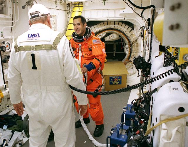 KENNEDY SPACE CENTER, FLA. -- In the White Room on Launch Pad 39A, STS-113 Mission Specialist John Herrington is helped with his launch and entry suit by Rick Welty, United Space Alliance Vehicle Closeout chief. The launch will carry the Expedition 6 crew to the Station and return the Expedition 5 crew to Earth. The major objective of the mission is delivery of the Port 1 (P1) Integrated Truss Assembly, which will be attached to the port side of the S0 truss. Three spacewalks are planned to install and activate the truss and its associated equipment. Launch of Space Shuttle Endeavour on mission STS-113 is scheduled for Nov. 23 at 7:50 p.m. EST.