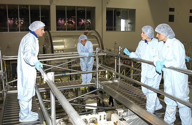 KENNEDY SPACE CENTER, FLA. - In the Space Station Processing Facility, STS-118 Commander Scott Kelly (left) and Mission Specialist Barbara Morgan (center) are briefed on equipment during Crew Equipment Interface Test activities. The mission to the International Space Station will be delivering the third starboard truss segment, the ITS S5, which will be attached to the station, and a SPACEHAB Single Cargo Module with supplies and equipment. Launch aboard Space Shuttle Columbia is scheduled for Nov. 13, 2003.