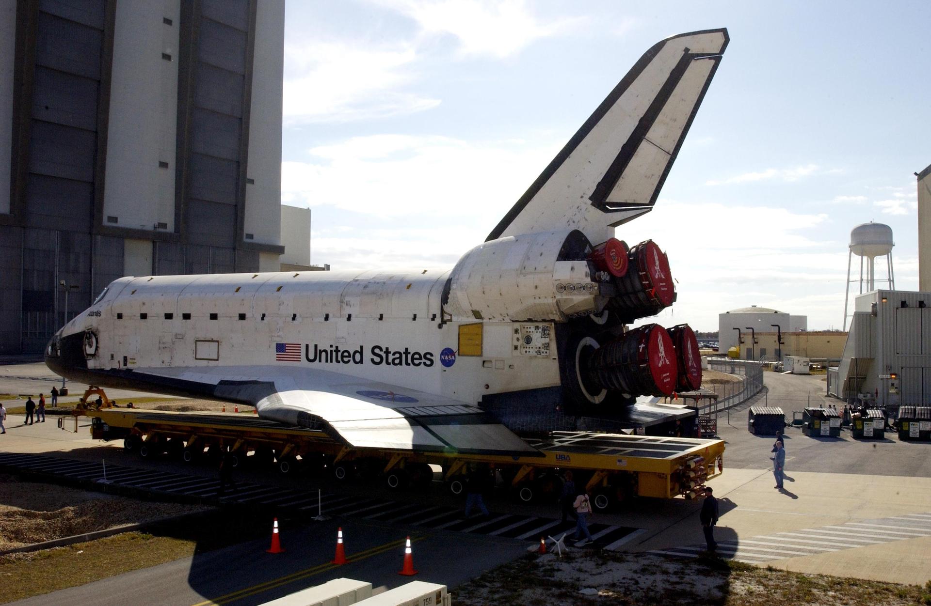 KENNEDY SPACE CENTER, FLA. -- Traveling about 5 mph, an orbiter transporter moves the orbiter Atlantis to the Vehicle Assembly Building for further processing. Atlantis will be flying on mission STS-114, a Utilization Logistics Flight -1 to the International Space Station. Along with a Multi-Purpose Logistics Module, Atlantis will also transport the next resident ISS crew, Expedition 7. Mission STS-114 is scheduled to launch March 1, 2003.