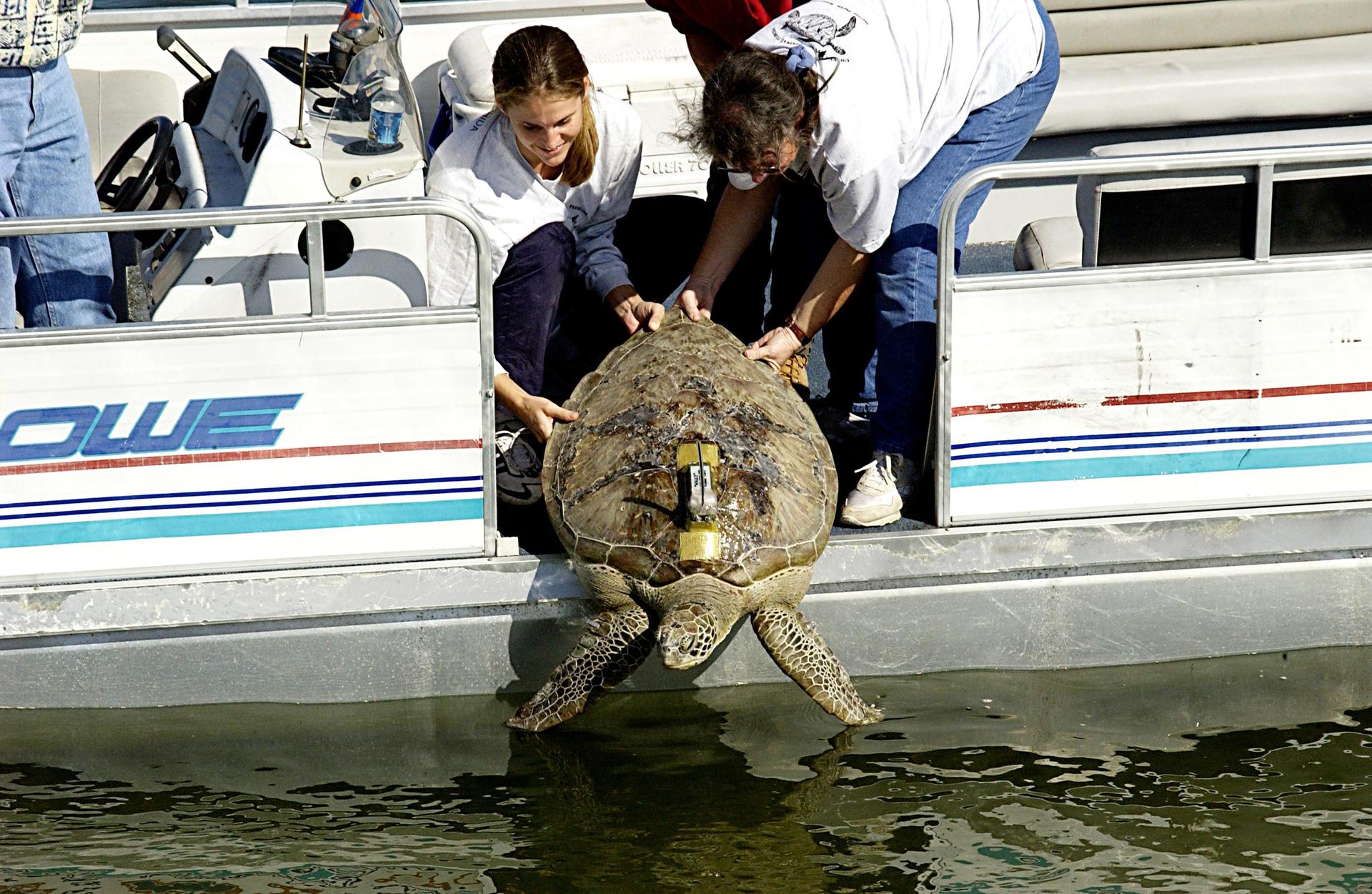 KENNEDY SPACE CENTER, FLA. -- A large sea turtle with a transmitter is released into the Mosquito Lagoon. It is one of several turtles found stunned, impacted by the unseasonal cold temperatures experienced in Central Florida. The cooperative effort of KSC contractor Dynamac Corporation's Aquatics Program and the Merritt Island National Wildlife Refuge warmed the turtles and evaluated them for release. Most were tagged and the largest one received a transmitter, provided by the University of Central Florida, for satellite tracking. The turtles were then transported through the Haulover Canal to a location away from the main channel for release.