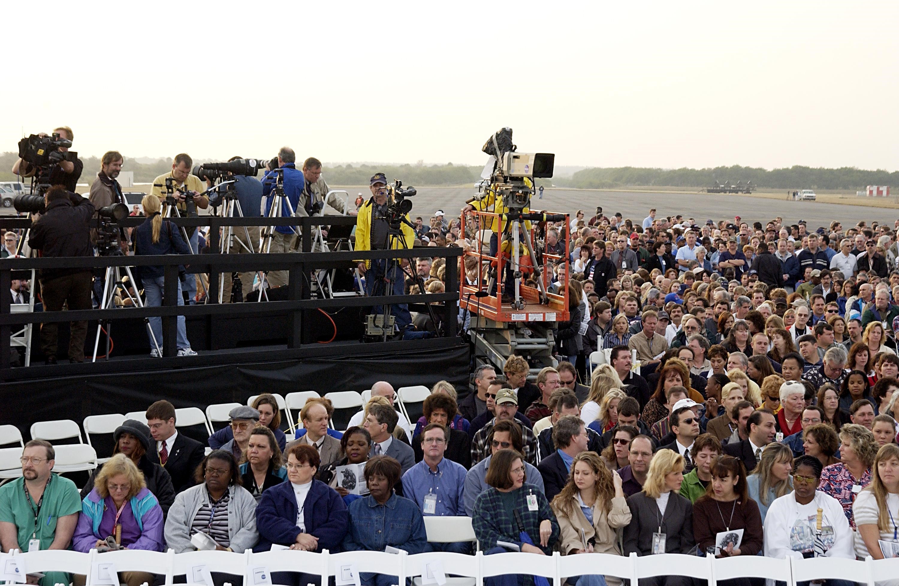 KENNEDY SPACE CENTER, FLA. - A Columbia Crew Memorial Service is held at the Shuttle Landing Facility for KSC employees and invited guests. The Columbia and her crew of seven were lost on Feb. 1, 2003, over East Texas as they returned to Earth after a 16-day research mission. Taking part in the service were NASA Administrator Sean O’Keefe, former KSC Director Robert Crippen, astronaut Jim Halsell, several employees, area clergymen, and members of Patrick Air Force Base. The service concluded with a “Missing Man Formation Fly Over” by NASA T-38 jet aircraft.
