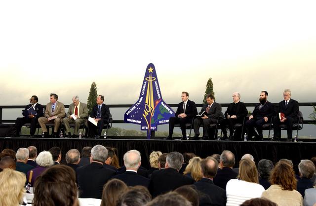 KENNEDY SPACE CENTER, FLA. - A Columbia Crew Memorial Service is held at the Shuttle Landing Facility for KSC employees and invited guests. The Columbia and her crew of seven were lost on Feb. 1, 2003, over East Texas as they returned to Earth after a 16-day research mission. Taking part in the service were NASA Administrator Sean O’Keefe, former KSC Director Robert Crippen, astronaut Jim Halsell, several employees, area clergymen, and members of Patrick Air Force Base. The service concluded with a “Missing Man Formation Fly Over” by NASA T-38 jet aircraft.