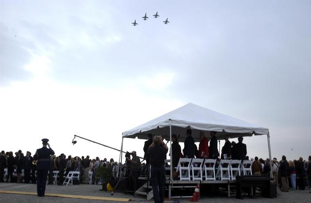 KENNEDY SPACE CENTER, FLA. - A Columbia Crew Memorial Service is held at the Shuttle Landing Facility for KSC employees and invited guests. The service concluded with a “Missing Man Formation Fly Over” by NASA T-38 jet aircraft, seen here. The Columbia and her crew of seven were lost on Feb. 1, 2003, over East Texas as they returned to Earth after a 16-day research mission. Taking part in the service were NASA Administrator Sean O’Keefe, former KSC Director Robert Crippen, astronaut Jim Halsell, several employees, area clergymen, and members of Patrick Air Force Base.