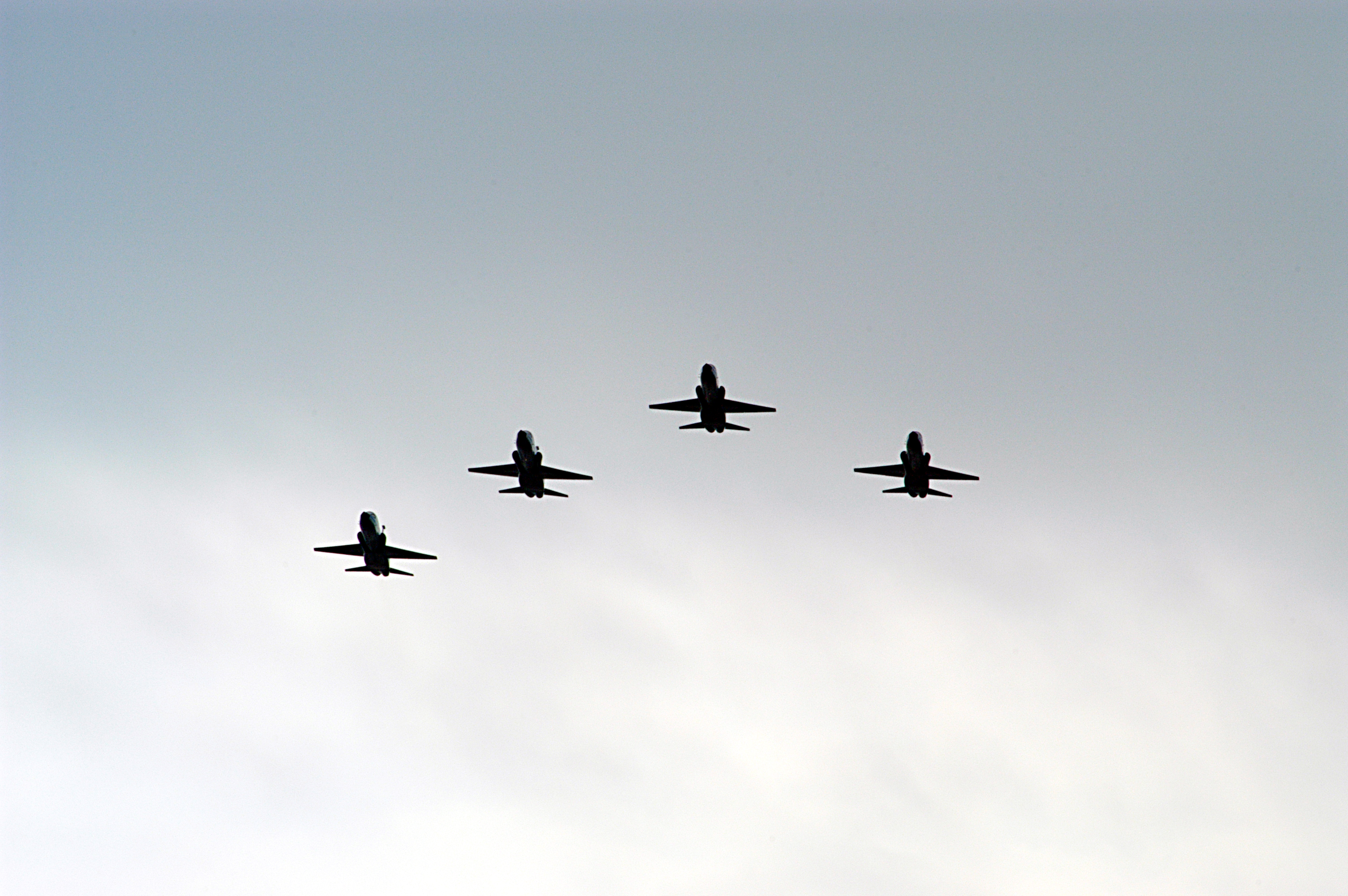 NASA T-38 jet aircraft are flying in a "Missing Man Formation" to conclude the memorial service for the crew of Columbia who were lost on Feb. 1, 2003, over East Texas as they returned to Earth after a 16-day research mission STS-107. The service was held at the Shuttle Landing Facility. Taking part in the service were NASA Administrator Sean O'Keefe, former KSC Director Robert Crippen, astronaut Jim Halsell, several employees, area clergymen, and members of Patrick Air Force Base. Crippen was the first to fly Columbia in 1981; Halsell first flew Columbia in 1994 and again in 1997.