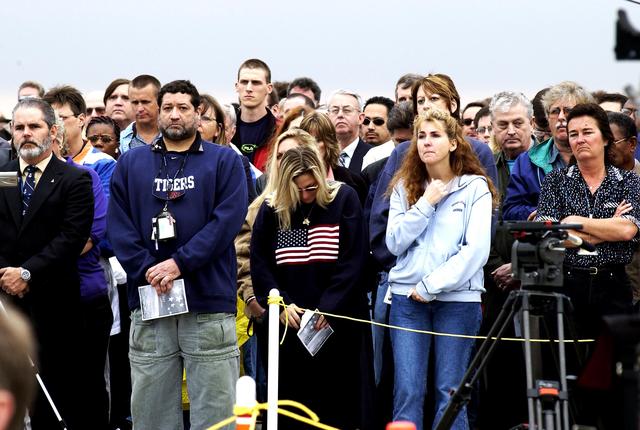 KENNEDY SPACE CENTER, FLA. -- Employees at KSC give solemn attention to the memorial service for the Columbia crew held at the Shuttle Landing Facility. The crew were lost on Feb. 1, 2003, over East Texas as they returned to Earth after the 16-day research mission STS-107. Taking part in the service were NASA Administrator Sean O'Keefe, former KSC Director Robert Crippen, astronaut Jim Halsell, several employees, area clergymen, and members of Patrick Air Force Base. Crippen was the first to fly Columbia in 1981; Halsell first flew Columbia in 1994 and again in 1997.