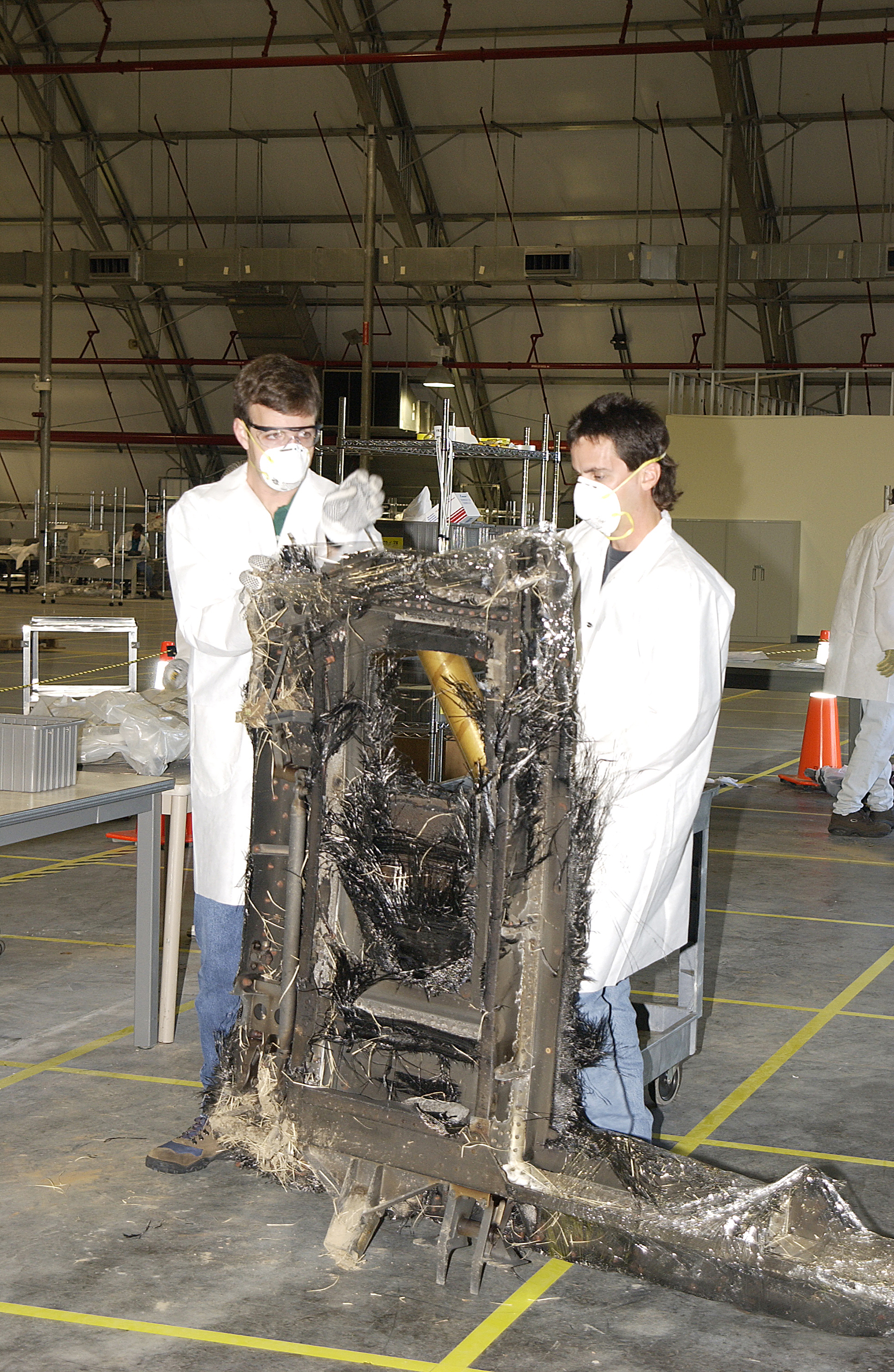 Columbia Reconstruction Project Team members move a piece of debris from the Space Shuttle Columbia into a specified sector of the RLV Hangar. The debris is being shipped to KSC from the collection point at Barksdale Air Force Base, Shreveport, La. As part of the ongoing investigation into the tragic accident that claimed Columbia and her crew of seven, workers will attempt to reconstruct the orbiter inside the hangar.