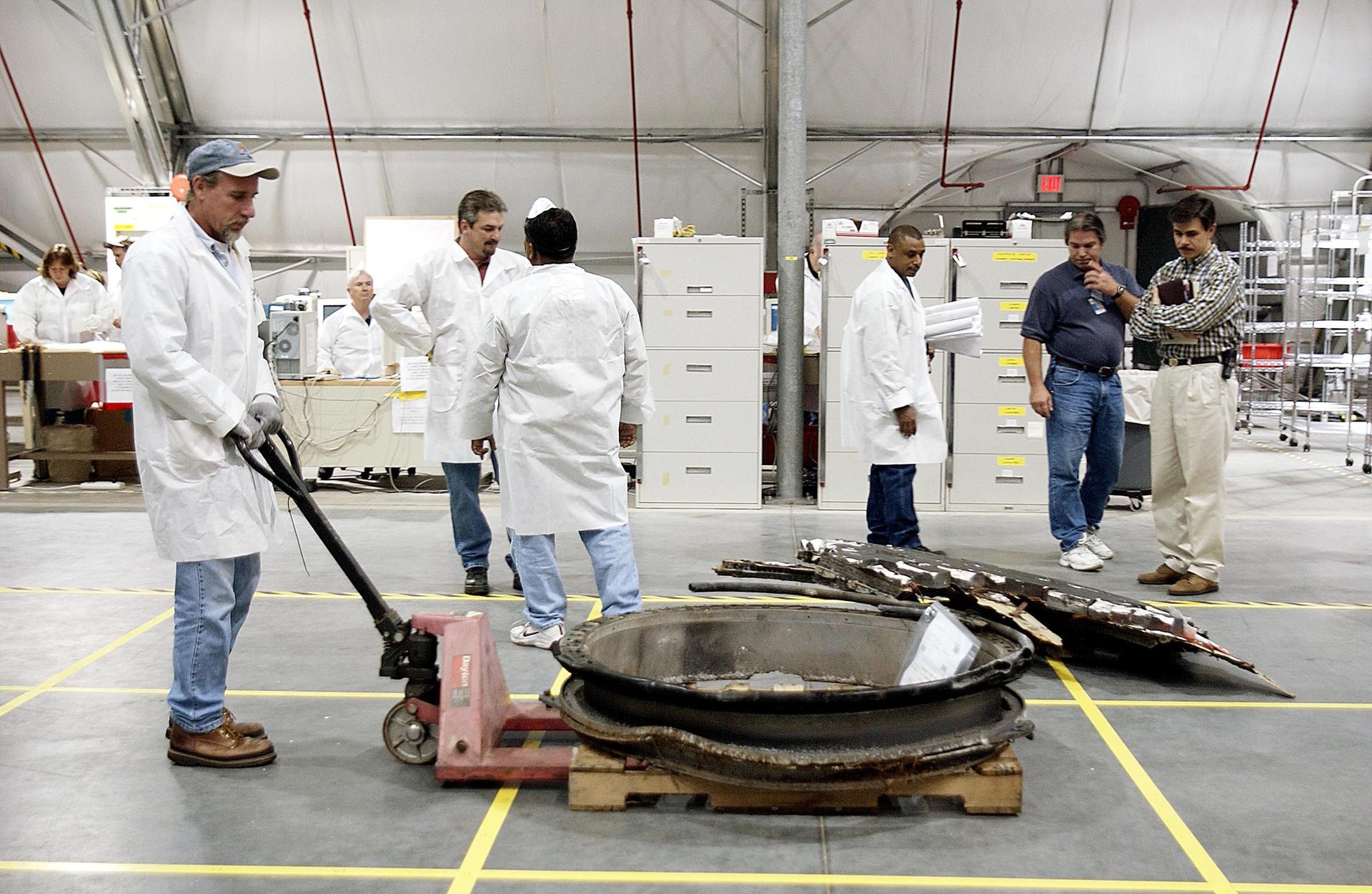 KENNEDY SPACE CENTER, FLA. -- Members of the Columbia Reconstruction Project Team move a piece of Columbia debris across the grid in the RLV Hangar. The team is examining Columbia materials and will attempt to reconstruct the orbiter as part of the investigation into the accident that caused the destruction of Columbia and loss of its crew as it returned to Earth on mission STS-107.