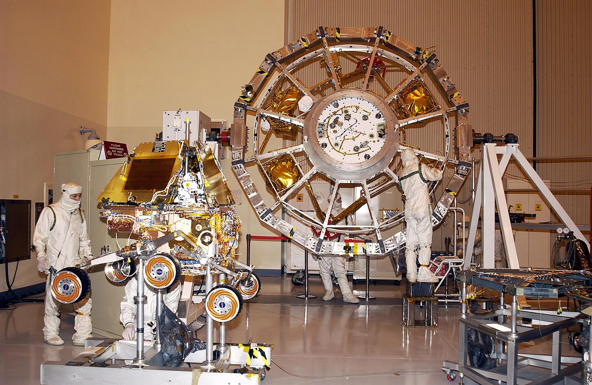 KENNEDY SPACE CENTER, FLA. -- Components of the flight hardware for Mars Exploration Rover-1 are in the Payload Hazardous Servicing Facility. At left is the rover. In the center is the cruise stage, which includes elements such as the thruster clusters, launch vehicle adapter and cruise electronics module. Each rover , aeroshell and lander will undergo a full mission simulation while at KSC. All flight elements will then be integrated. After spin balance testing, each spacecraft will be mated to a solid propellant upper stage booster that will propel it out of Earth orbit. The rovers will serve as robotic geologists to seek answers about the evolution of Mars, particularly for a history of water. The rovers will be identical to each other, but will land at different regions of Mars. Launch of the MER-1 is scheduled for May 30. MER-2 will follow June 25.