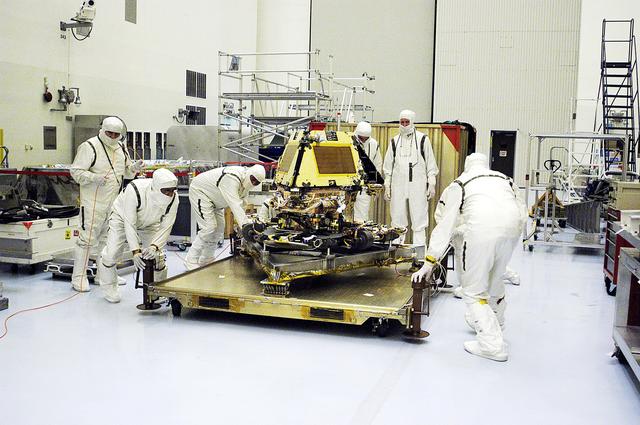 KENNEDY SPACE CENTER, Fla. - In the Payload Hazardous Servicing Facility, workers appear to adjust the platform holding the second Mars Exploration Rover, MER-1. It will undergo prelaunch testing, including deployment of the lander petals, the rover's solar arrays, camera mast and camera. While at KSC, each of the rovers, their aeroshells and landers will undergo a full mission simulation. After spin balance testing, each spacecraft will be mated to a solid propellant upper stage booster that will propel the spacecraft out of Earth orbit. Approximately 10 days before launch they will be transported to the launch pad for mating with their respective Boeing Delta II rockets. The rovers will serve as robotic geologists to seek answers about the evolution of Mars, particularly for a history of water. The rovers are identical to each other, and will land at different regions of Mars. Launch of the MER-1 is scheduled for May 30. MER-2 will follow June 25.
