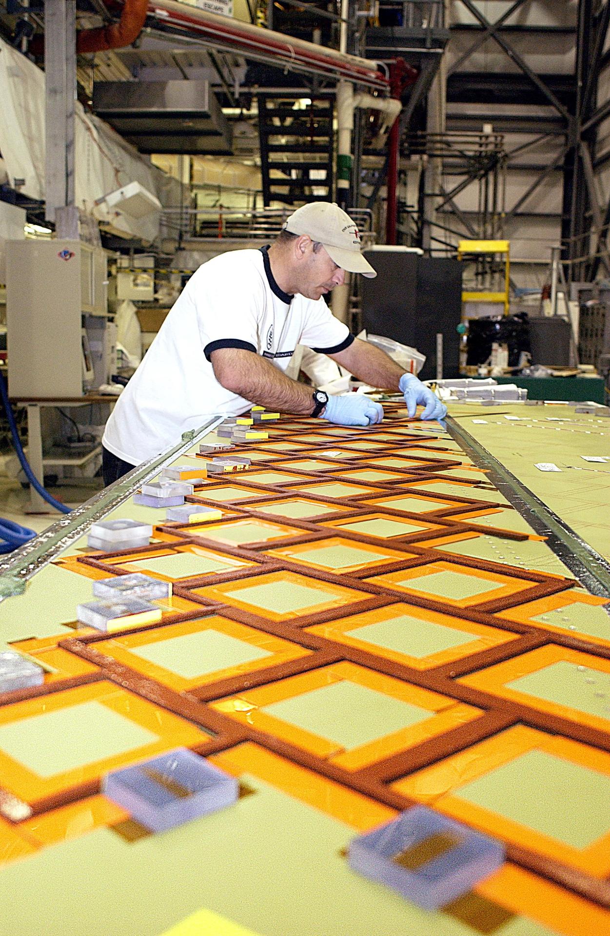 KENNEDY SPACE CENTER, FLA. -- In the Orbiter Processing Facility, United Space Alliance employee Mike Cote installs Thermal Protection System tiles on a test panel. The test panel and sections of Space Shuttle orbiter Enterprise (OV-101) will be transferred to the Southwest Research Institute for testing after the tile installation is complete. The testing has been requested by the Columbia Accident Investigation Board. Sections of Enterprise were borrowed from the Smithsonian Institution's Air and Space Museum where the orbiter is being stored at the Washington Dulles International Airport. Enterprise was the first orbiter built in the Shuttle fleet and was used to conduct the Approach and Landing Test Program before the first powered Shuttle flight.