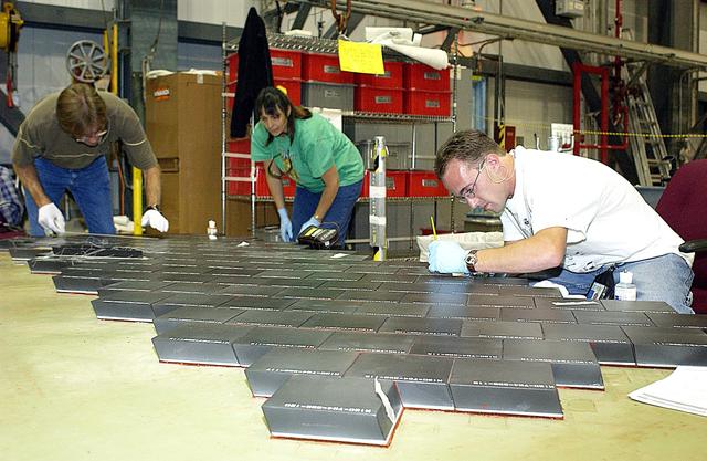 KENNEDY SPACE CENTER, FLA. -- In the Orbiter Processing Facility, United Space Alliance employees (from left) Harrell Watts, Lynn Wozniak, and Jason Levandusky install Thermal Protection System tiles on a main landing gear door of Space Shuttle orbiter Enterprise (OV-101). Sections of Enterprise were borrowed from the Smithsonian Institution's Air and Space Museum where the orbiter is being stored at the Washington Dulles International Airport. Enterprise was the first orbiter built in the Shuttle fleet and was used to conduct the Approach and Landing Test Program before the first powered Shuttle flight. After the tile installation is complete, the sections will be transferred to the Southwest Research Institute for testing requested by the Columbia Accident Investigation Board.