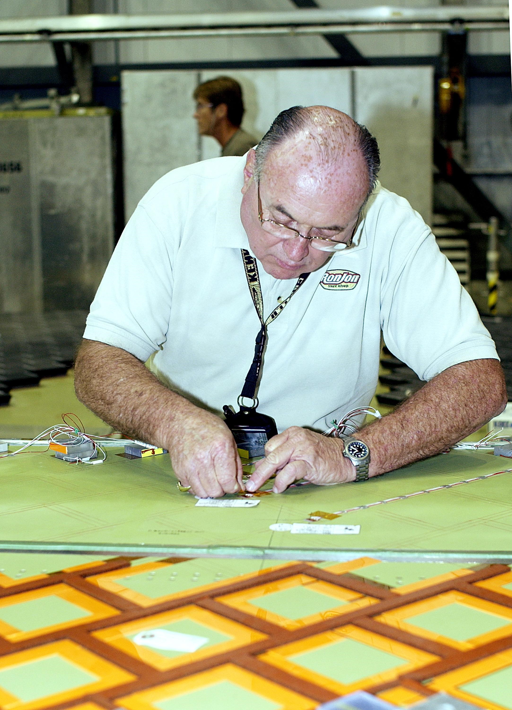 KENNEDY SPACE CENTER, FLA. -- In the Orbiter Processing Facility, an employee from The Boeing Co., Huntington Beach, Calif., installs a strain gauge on a test panel prior to installation of Thermal Protection System tile on the panel. The test panel and sections of Space Shuttle orbiter Enterprise (OV-101) will be transferred to the Southwest Research Institute for testing after the tile installation is complete. The testing has been requested by the Columbia Accident Investigation Board. Sections of Enterprise were borrowed from the Smithsonian Institution's Air and Space Museum where the orbiter is being stored at the Washington Dulles International Airport. Enterprise was the first orbiter built in the Shuttle fleet and was used to conduct the Approach and Landing Test Program before the first powered Shuttle flight.