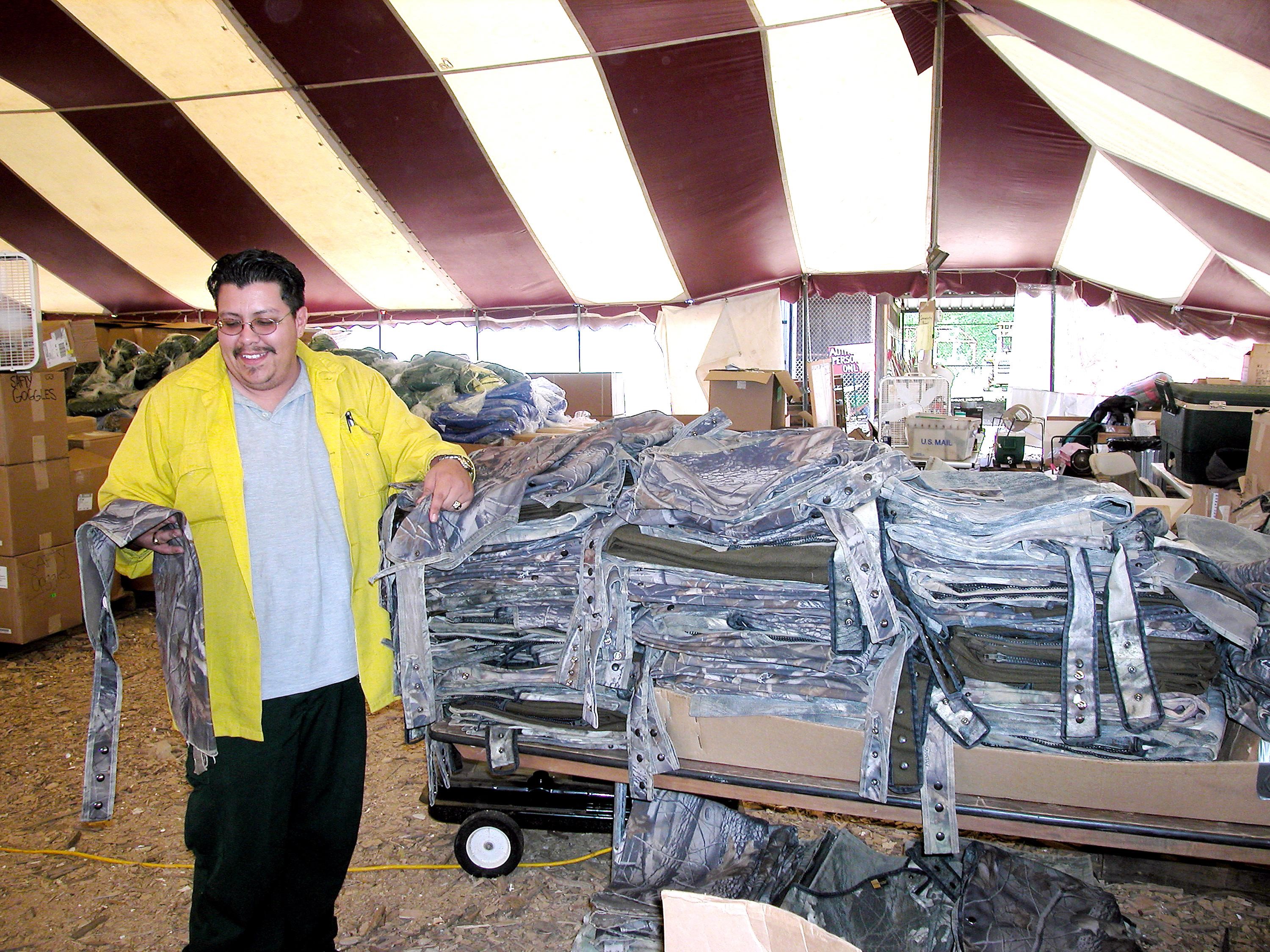 KENNEDY SPACE CENTER, FLA. -- Temporary camp worker Michael Trujillo of North New Mexico displays chaps in the supply tent at the Nacogdoches site. The chaps are used by U.S. Forest Service, Environmental Protection Agency and space program workers searching through dense forests in East Texas. Kennedy Space Center workers are participating in the Columbia Recovery efforts at the Lufkin (Texas) Command Center, four field sites in East Texas, and the Barksdale, La., hangar site. KSC is working with representatives from other NASA Centers and with those from a number of federal, state and local agencies in the recovery effort. KSC provides vehicle technical expertise in the field to identify, collect and return Shuttle hardware to KSC.