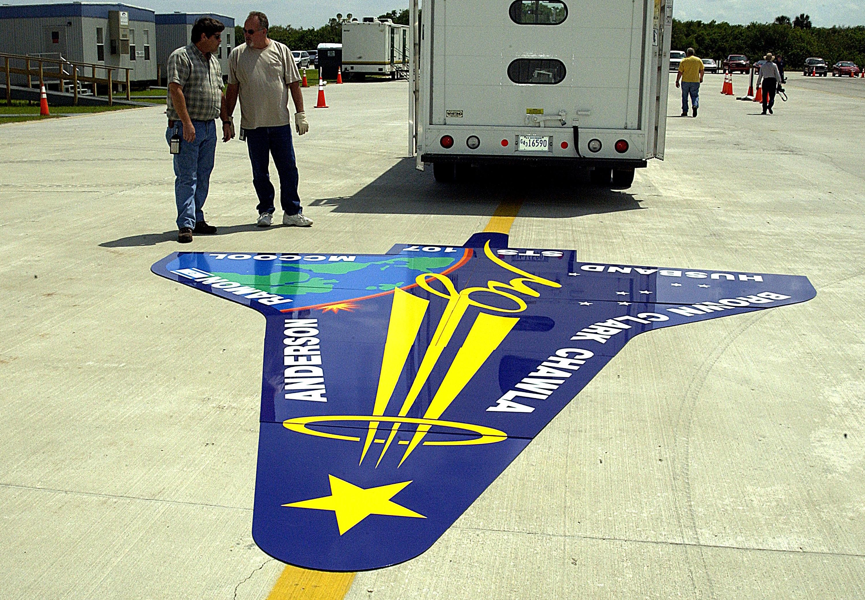 KENNEDY SPACE CENTER, FLA. -- Workers deliver an enlarged replica of the STS-107 crew emblem to the RLV Hangar where it will be installed on an outside wall. Inside the hangar, members of the Columbia Reconstruction Project team are identifying pieces of Columbia debris as they arrive at Kennedy Space Center and placing them on a grid approximating the shape of the orbiter.