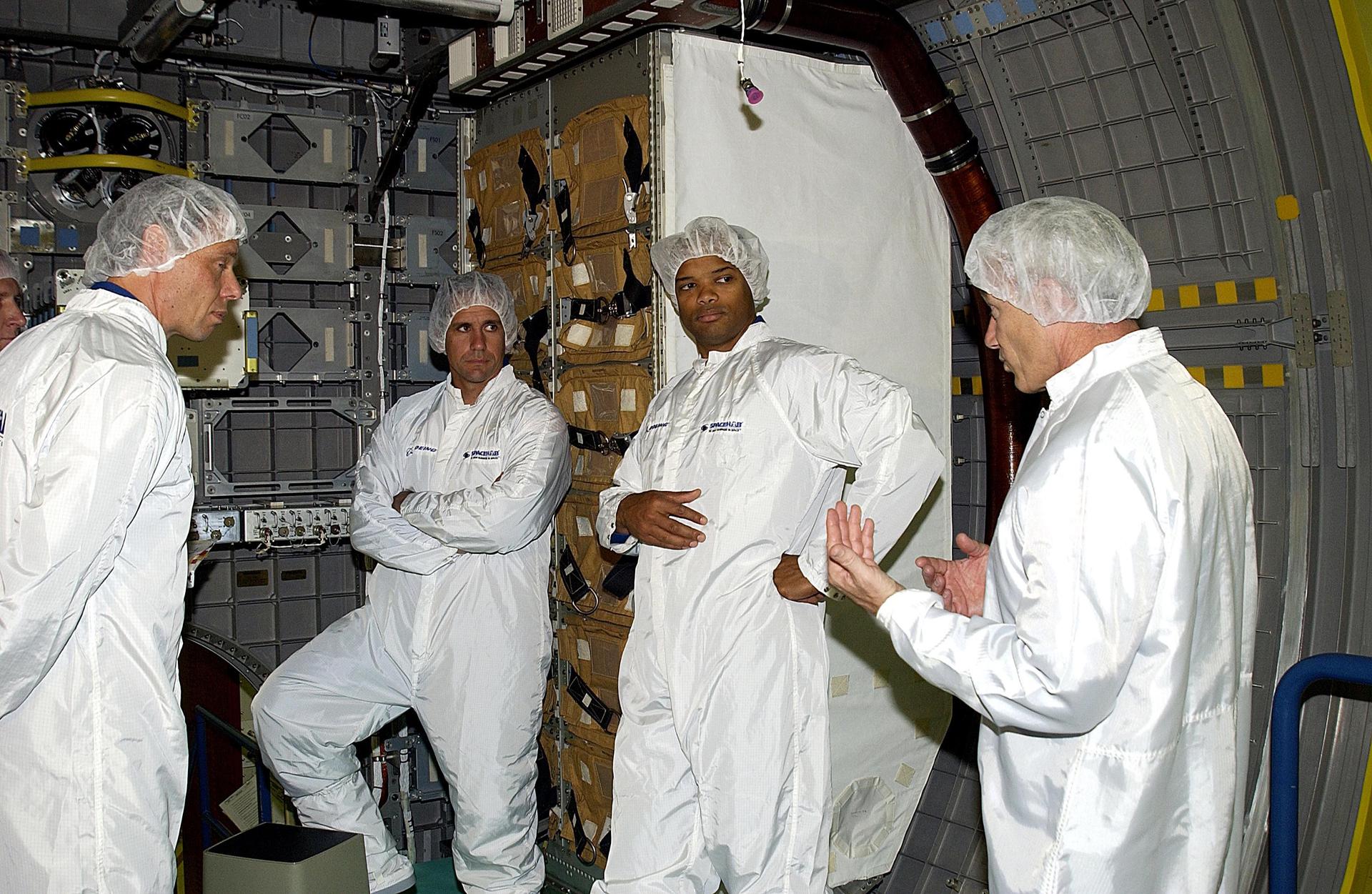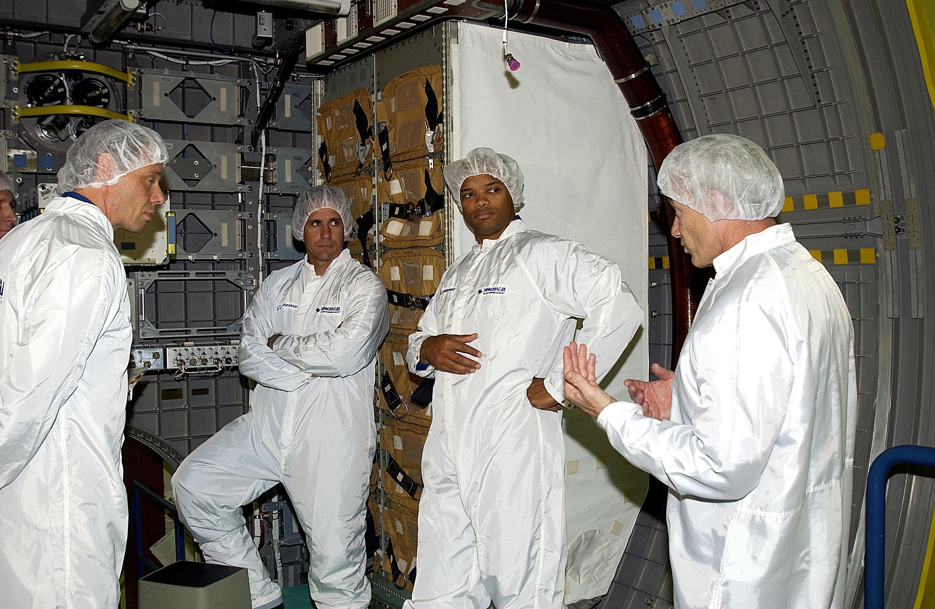 KENNEDY SPACE CENTER, FLA. - At SPACEHAB, Port Canaveral, Fla., STS-116 crew members take part in training for their mission. Seen here are (from left) Mission Specialist Christer Fuglesang, Pilot Michael Oelefein, Mission Specialist Robert Curbeam and Commander Terrence Wilcutt. Fuglesang is with the European Space Agency. Objective of their mission to the International Space Station is to deliver and attach the third port truss segment, the P5 Truss, deactivate and retract the P6 Truss Channel 4B (port-side) solar array, and reconfigure station power from 2A and 4A solar arrays. A launch date is under review.
