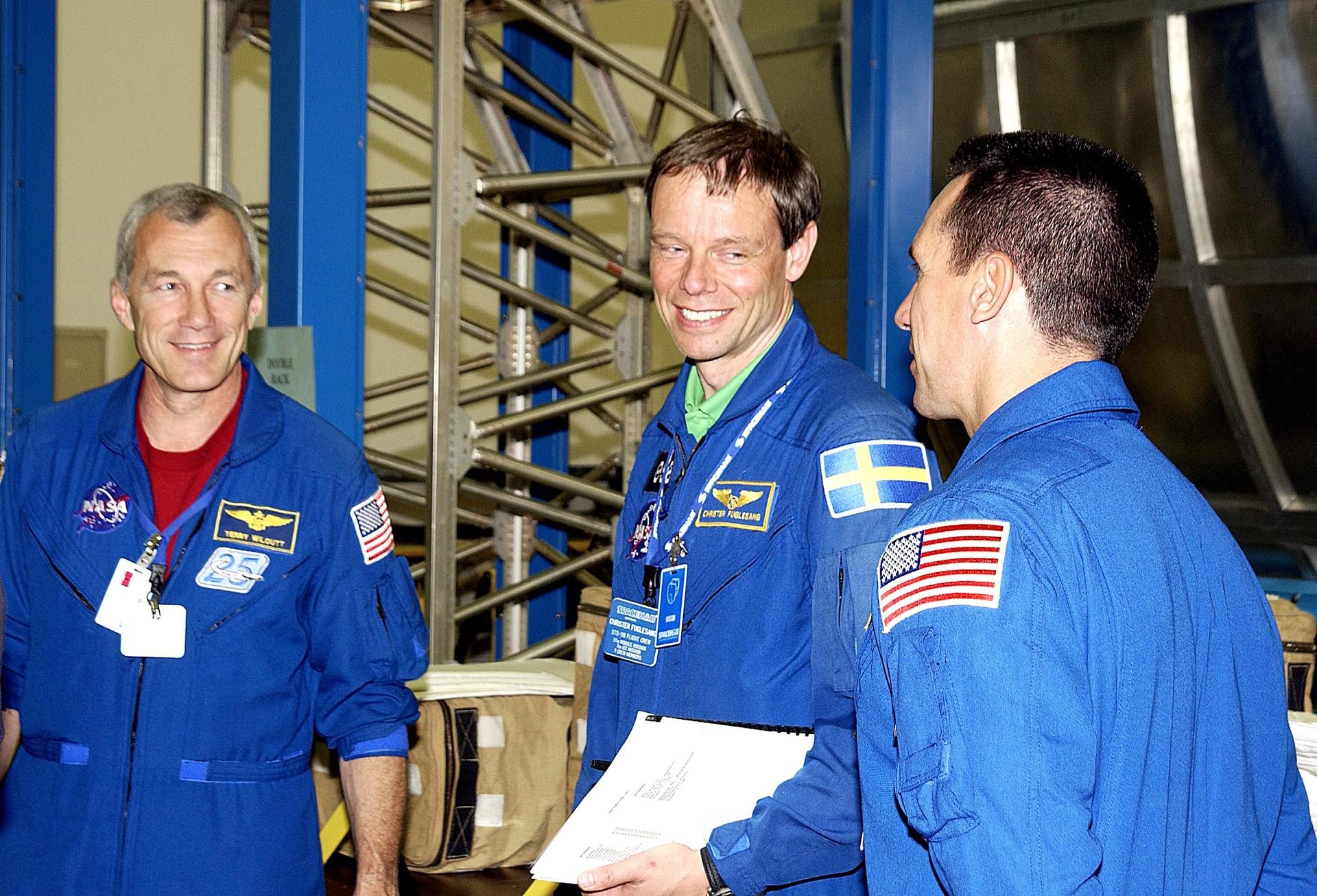 KENNEDY SPACE CENTER, FLA. - During a break in training at SPACEHAB, Port Canaveral, Fla., STS-116 Commander Terrence Wilcutt, Mission Specialist Christer Fuglesang and Pilot Michael Oelefein share a laugh. Not seen is Mission Specialist Robert Curbeam. Objective of their mission to the International Space Station is to deliver and attach the third port truss segment, the P5 Truss, deactivate and retract the P6 Truss Channel 4B (port-side) solar array, and reconfigure station power from 2A and 4A solar arrays. A launch date is under review.