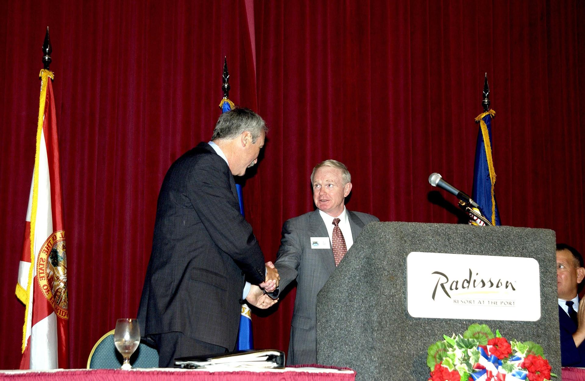 KENNEDY SPACE CENTER, FLA. - During the annual Congressional Dinner hosted by the Florida Space Business Roundtable, Center Director Roy Bridges Jr. introduces the keynote speaker, NASA Administrator Sean O'Keefe. Held April 28-May 1, 2003, in Cape Canaveral, Fla., the event commemorated the 40th anniversary of the Kennedy Space Center and the Centennial of Flight. The theme for the Space Congress was "Linking the Past to the Future: A Celebration of Space." The international conference gathers attendees from the scientific community, the space industry workforce, educators and local supporting industries.