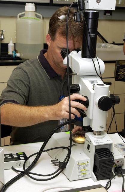 KENNEDY SPACE CENTER, FLA. - NASA Project Manager Guy Ethridge examines C. elegans nemotodes (round worms) under a microscope. These specimens were found in a Biological Research in Canisters (BRIC) container, a middeck experiment that was among the Columbia debris recovered in East Texas. The worms are descendants of those that were part of an experiment that flew on Columbia's last mission, STS-107. The experiment was designed to verify a new synthetic nutrient solution for an International Space Station (ISS) "model" specimen planned to be used extensively for ISS gene expression studies and was sponsored by the NASA Ames Research Center. Scientists are now looking over the experiment at KSC to determine if it will yield any scientific results. The investigation into the cause of the Columbia accident is ongoing.