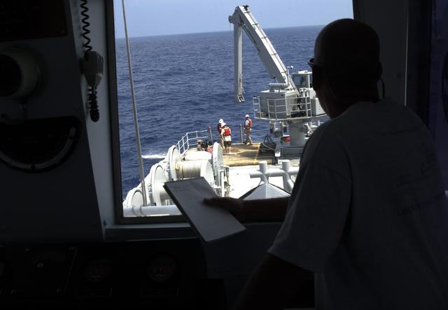 KENNEDY SPACE CENTER, FLA. - A view from inside the pilot house of the Liberty Star overlooks the stern where a team secures lines to underwater research equipment being used on an expedition to characterize the condition of the deep-sea coral reefs and reef fish populations in the Oculina Banks. The banks are a marine protected area, 20 miles offshore of the east coast of Florida. The equipment includes an underwater robot, a seafloor sampler, and the Passive Acoustic Monitoring System (PAMS), originally developed by NASA to monitor the impact of rocket launches on wildlife refuge lagoons at KSC. The research is sponsored by NOAA Fisheries. The ship departed from Port Canaveral April 29 and will return May 9.