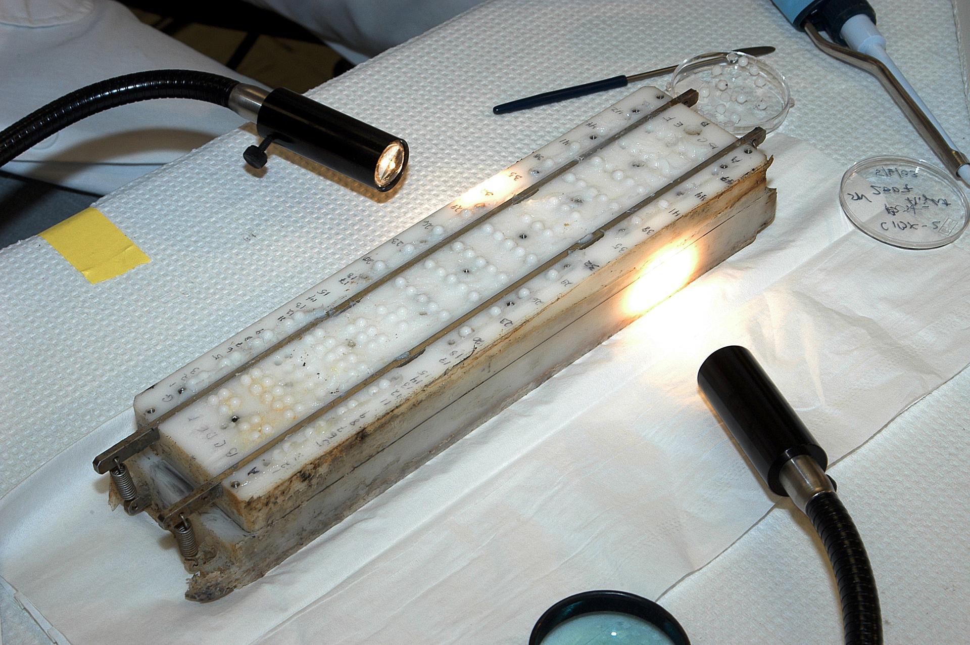 KENNEDY SPACE CENTER, FLA. - The apparatus shown was designed to hold microcapsules for research on mission STS-107. It is one over several included in the Commercial ITA Biomedical Experiments payload. The box was recently recovered during the search for Columbia debris. The drug delivery system and spaceflight hardware was developed jointly by JSC, the Institute for Research Inc. and Instrumentation Technology Associates Inc. to conduct microencapsulation experiments under microgravity conditions.
