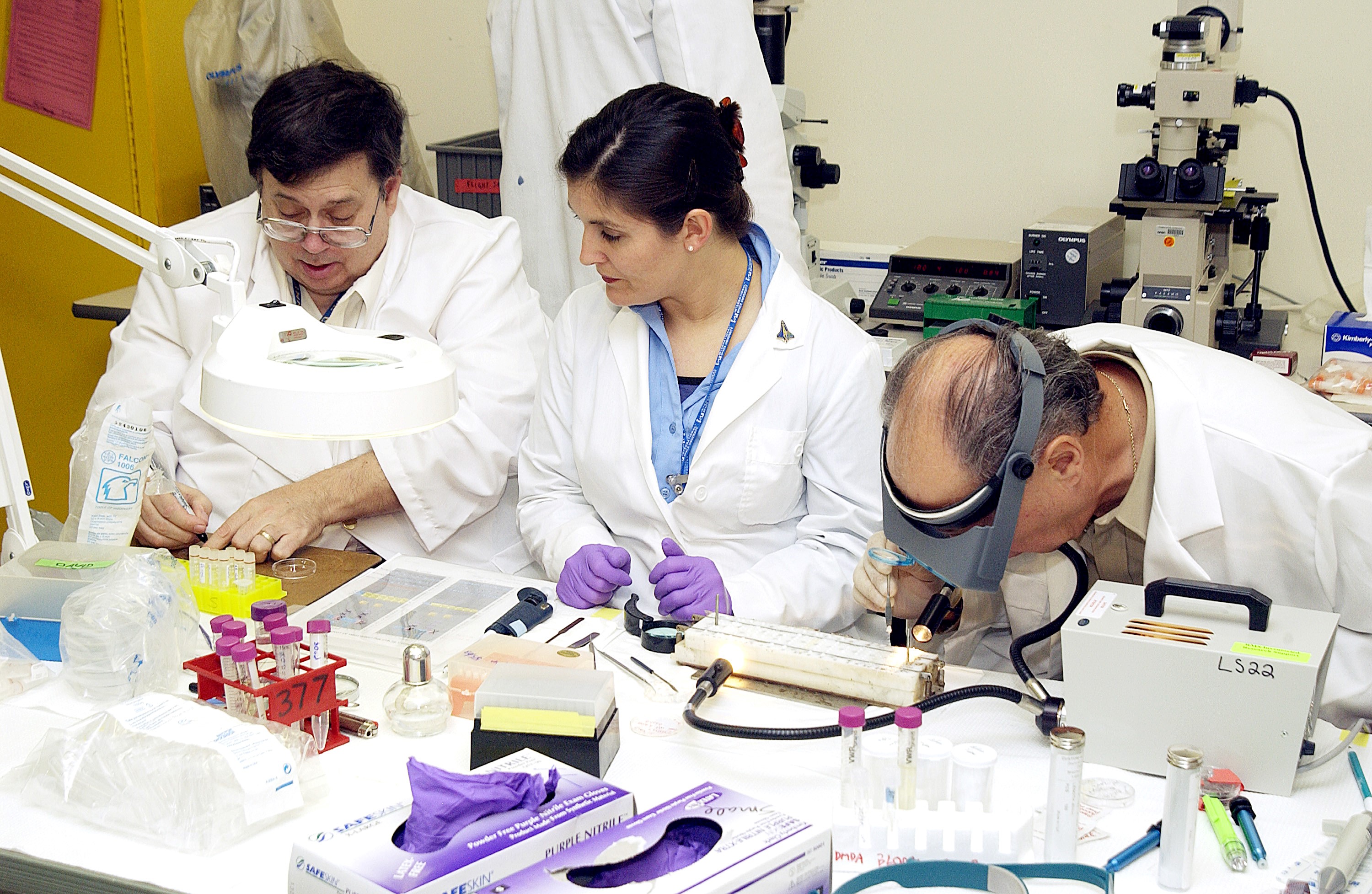 KENNEDY SPACE CENTER, FLA. - From left, Barry Perlman, Pembroke Pines Charter Middle School in Florida; Valerie Cassanto, Instrumentation Technology Associates, Inc.; and Dr. Dennis Morrison, NASA Johnson Space Center, process one of the experiments carried on mission STS-107. Several experiments were found during the search for Columbia debris. Included in the Commercial ITA Biomedical Experiments payload on mission STS-107 are urokinase cancer research, microencapsulation of drugs, the Growth of Bacterial Biofilm on Surfaces during Spaceflight (GOBBSS), and tin crystal formation. The latter was sponsored by the Pembroke Pines Charter Middle School.