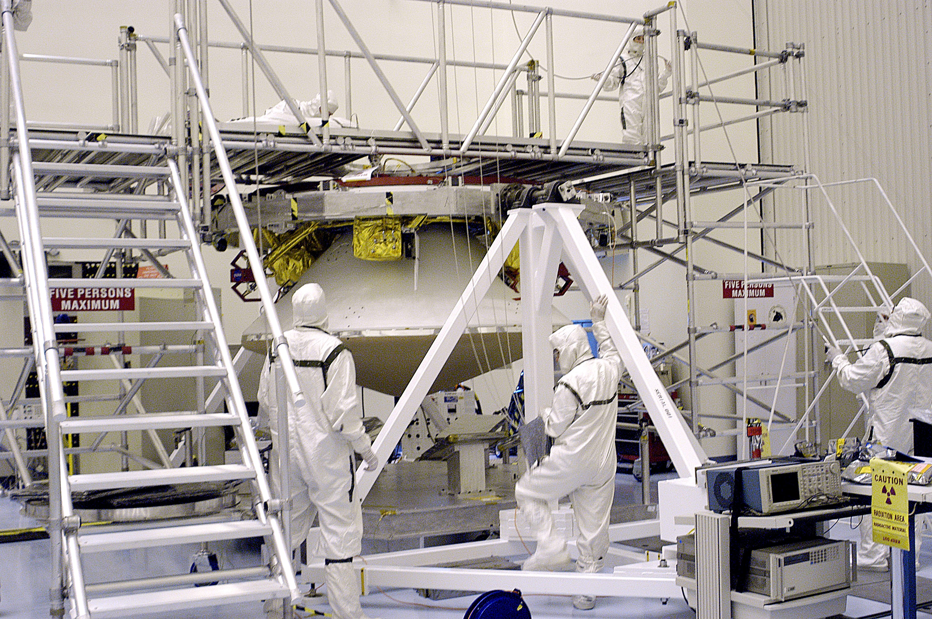 KENNEDY SPACE CENTER, FLA. - In the Payload Hazardous Servicing Facility, the cruise stage is mated to the Mars Exploration Rover 2 (MER-2) entry vehicle. The cruise stage includes fuel tanks, thruster clusters and avionics for steering and propulsion. NASA's twin Mars Exploration Rovers are designed to study the history of water on Mars. These robotic geologists are equipped with a robotic arm, a drilling tool, three spectrometers, and four pairs of cameras that allow them to have a human-like, 3D view of the terrain. Each rover could travel as far as 100 meters in one day to act as Mars scientists' eyes and hands, exploring an environment where humans can't yet go. MER-2 is scheduled to launch June 5 as MER-A aboard a Delta rocket from Cape Canaveral Air Force Station.