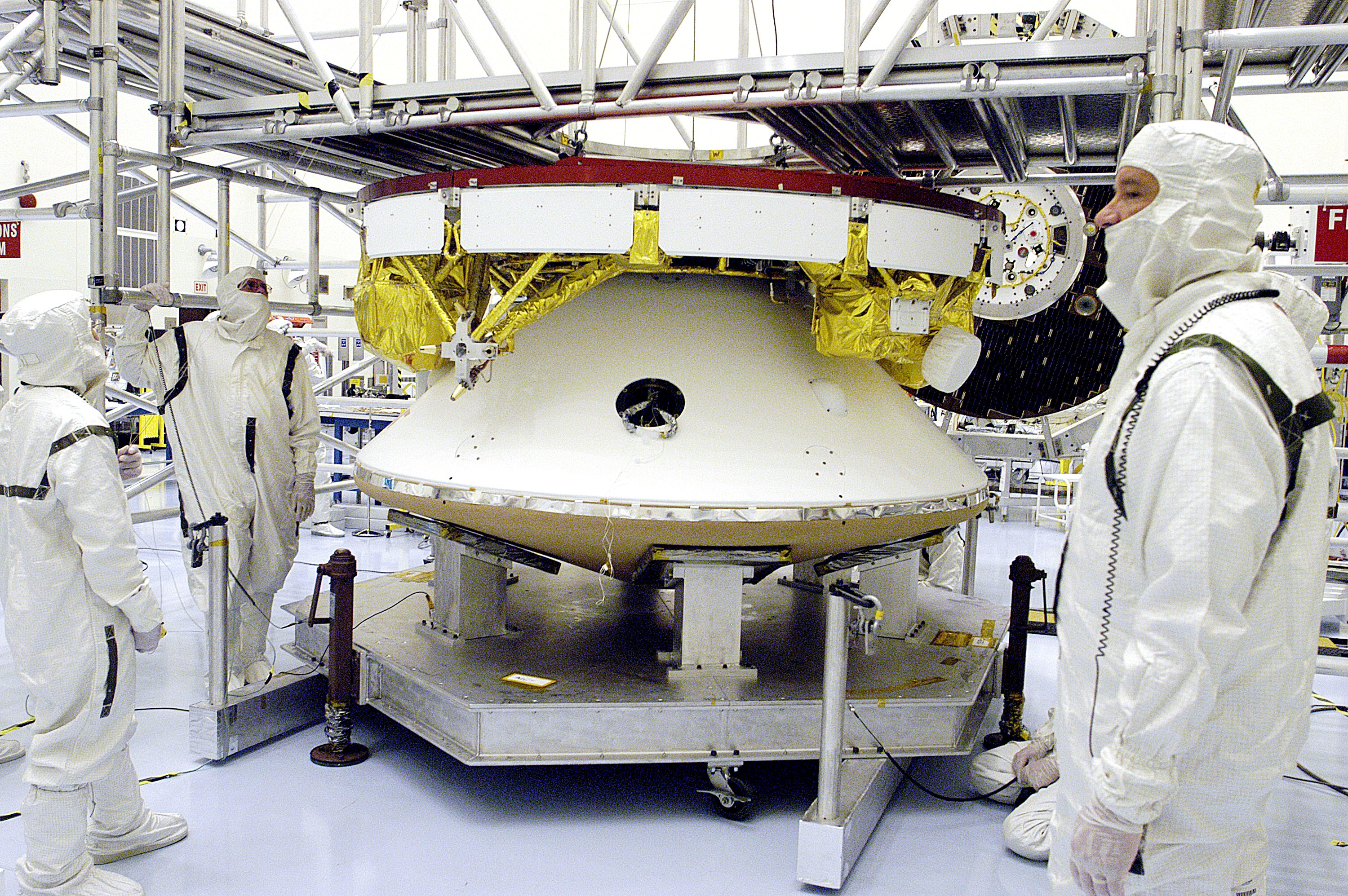KENNEDY SPACE CENTER, FLA. - The Mars Exploration Rover 2 (MER-2) undergoes a weight and center of gravity determination in the Payload Hazardous Servicing Facility. NASA's twin Mars Exploration Rovers are designed to study the history of water on Mars. These robotic geologists are equipped with a robotic arm, a drilling tool, three spectrometers, and four pairs of cameras that allow them to have a human-like, 3D view of the terrain. Each rover could travel as far as 100 meters in one day to act as Mars scientists' eyes and hands, exploring an environment where humans can't yet go. Launch of MER-2 is scheduled for June 5 from Cape Canaveral Air Force Station.