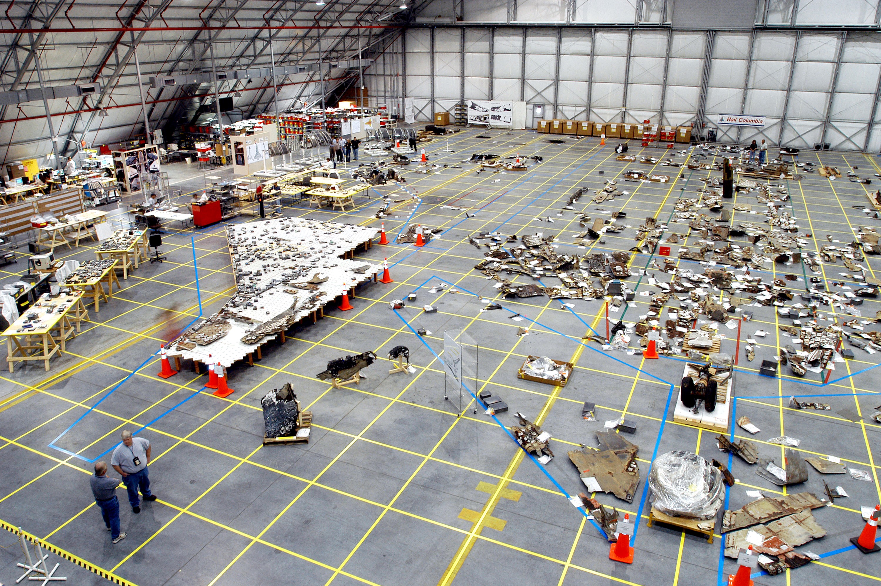 KENNEDY SPACE CENTER, FLA. - An overview of the Columbia debris hangar shows the orbiter outline on the floor with some of the 78,760 pieces identified to date, as well as tables on the left that hold tiles. More than 82,500 pieces of shuttle debris have been rcovered.