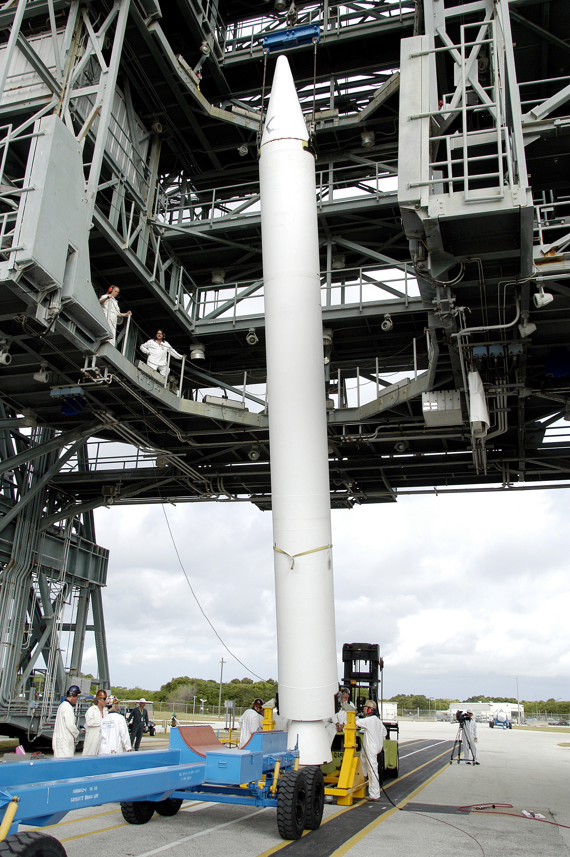 KENNEDY SPACE CENTER, FLA. - On Launch Complex 17-B, Cape Canaveral Air Force Station, a solid rocket booster is lifted to vertical. It will be mated to the Delta II rocket for the Mars Exploration Rover 1 (MER-1) launch June 25. NASA’s twin Mars Exploration Rovers are designed to study the history of water on Mars. These robotic geologists are equipped with a robotic arm, a drilling tool, three spectrometers, and four pairs of cameras that allow them to have a human-like, 3D view of the terrain. Each rover could travel as far as 100 meters in one day to act as Mars scientists' eyes and hands, exploring an environment where humans can’t yet go. MER-2 (MER-A) will launch June 5.