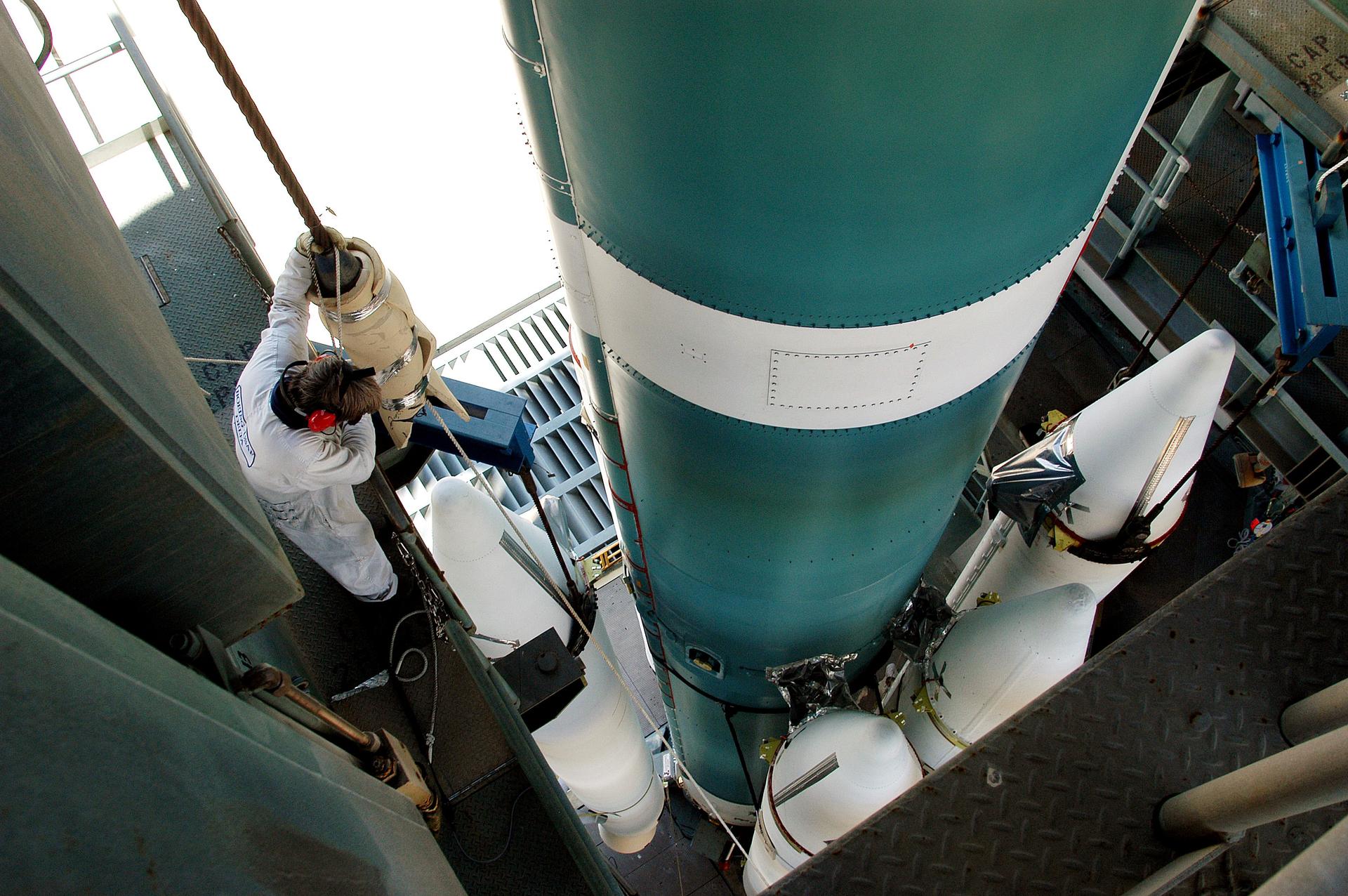 KENNEDY SPACE CENTER, FLA. - On the launch tower of Launch Complex 17-B, Cape Canaveral Air Force Station, solid rocket boosters are mated to the Delta II rocket for the Mars Exploration Rover 1 (MER-1) launch June 25. NASA’s twin Mars Exploration Rovers are designed to study the history of water on Mars. These robotic geologists are equipped with a robotic arm, a drilling tool, three spectrometers, and four pairs of cameras that allow them to have a human-like, 3D view of the terrain. Each rover could travel as far as 100 meters in one day to act as Mars scientists' eyes and hands, exploring an environment where humans can’t yet go. MER-2 (MER-A) will launch June 5.
