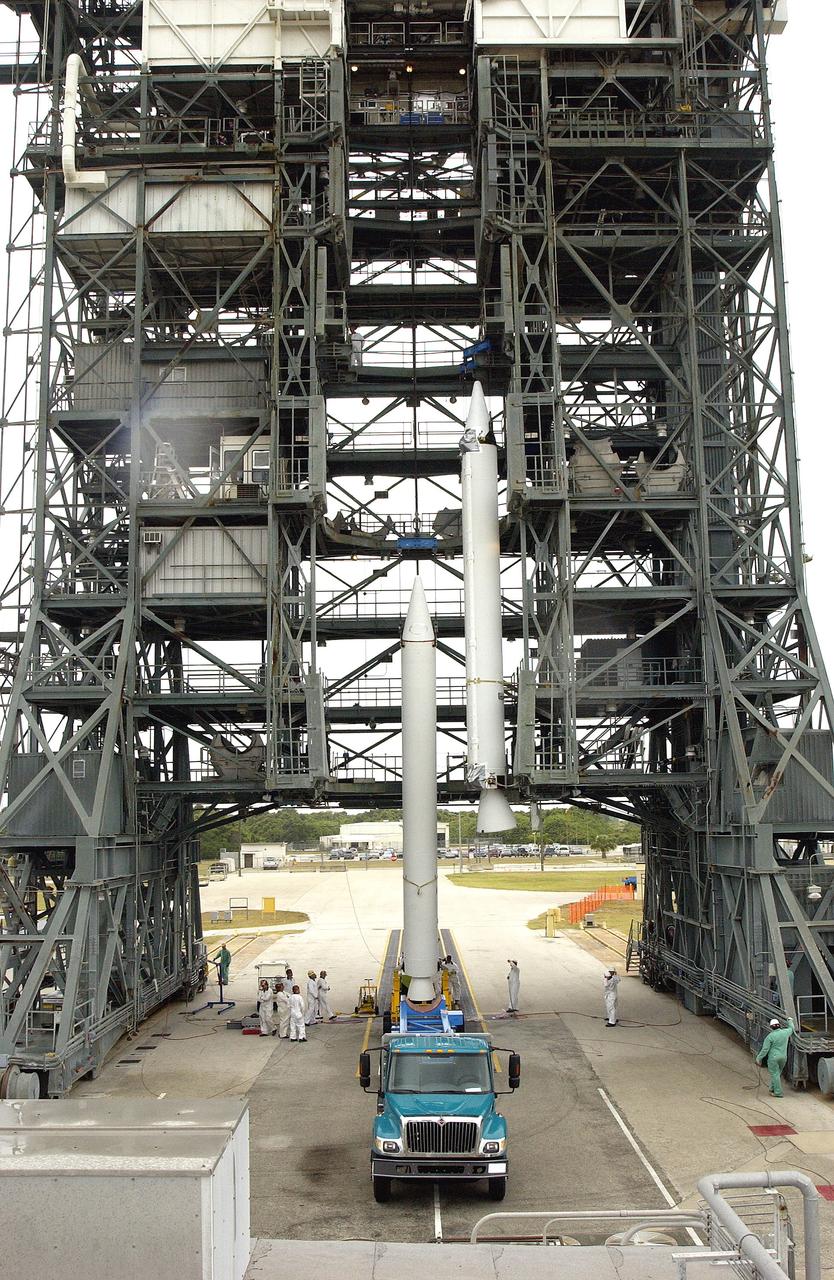 KENNEDY SPACE CENTER, FLA. - Another solid rocket booster is lifted up the launch tower on Launch Complex 17-B, Cape Canaveral Air Force Station. It will be mated to the Delta II rocket for the Mars Exploration Rover 1 (MER-1) launch June 25. NASA’s twin Mars Exploration Rovers are designed to study the history of water on Mars. These robotic geologists are equipped with a robotic arm, a drilling tool, three spectrometers, and four pairs of cameras that allow them to have a human-like, 3D view of the terrain. Each rover could travel as far as 100 meters in one day to act as Mars scientists' eyes and hands, exploring an environment where humans can’t yet go. MER-2 (MER-A) will launch June 5.