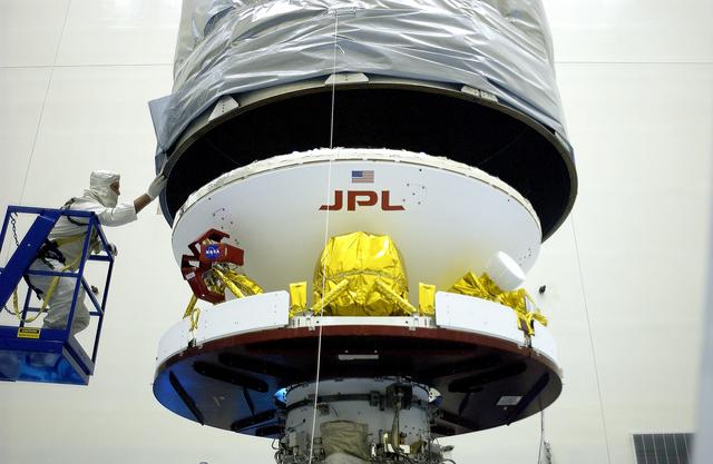 KENNEDY SPACE CENTER, FLA. - In the Payload Hazardous Servicing Facility, the Mars Exploration Rover 2 (MER-2) is being encapsulated for transfer to Launch Complex 17-A, Cape Canaveral Air Force Station. MER-2 is one of NASA's twin Mars Exploration Rovers designed to study the history of water on Mars. These robotic geologists are equipped with a robotic arm, a drilling tool, three spectrometers, and four pairs of cameras that allow them to have a human-like, 3D view of the terrain. Each rover could travel as far as 100 meters in one day to act as Mars scientists' eyes and hands, exploring an environment where humans can't yet go. MER-2 is scheduled to launch no earlier than June 8 as MER-A aboard a Delta II rocket.