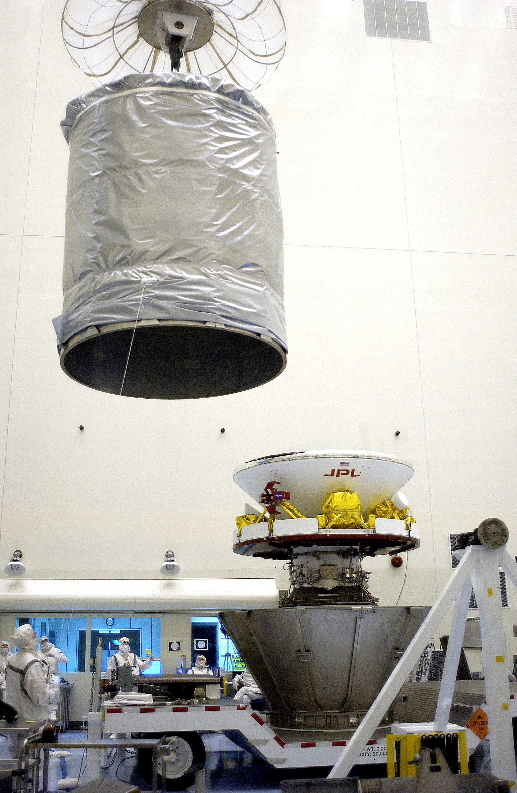 KENNEDY SPACE CENTER, FLA. - In the Payload Hazardous Servicing Facility, an overhead crane moves the canister that will complete encapsulation of the Mars Exploration Rover 2 (MER-2), at right. After encapsulation, MER-2 will be transferred to Launch Complex 17-A, Cape Canaveral Air Force Station. MER-2 is one of NASA's twin Mars Exploration Rovers designed to study the history of water on Mars. These robotic geologists are equipped with a robotic arm, a drilling tool, three spectrometers, and four pairs of cameras that allow them to have a human-like, 3D view of the terrain. Each rover could travel as far as 100 meters in one day to act as Mars scientists' eyes and hands, exploring an environment where humans can't yet go. MER-2 is scheduled to launch no earlier than June 8 as MER-A aboard a Delta II rocket.