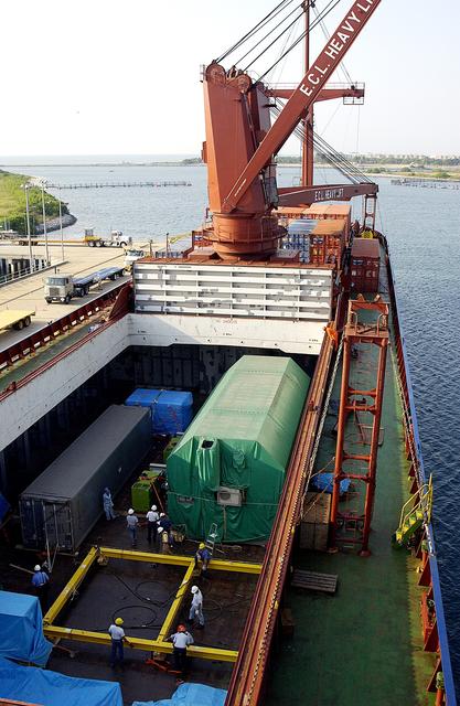 KENNEDY SPACE CENTER, FLA. - The Japanese Experiment Module (JEM) Pressurized Module is ready to be offloaded from the ship that carried it from Japan. The National Space Development Agency of Japan (NASDA) built the laboratory at the Tsukuba Space Center near Tokyo. The Pressurized Module is the first element of the JEM, Japan’s primary contribution to the space station, to be delivered to KSC. It will enhance the unique research capabilities of the orbiting complex by providing an additional shirt-sleeve environment for astronauts to conduct science experiments. The JEM also includes two logistics modules, an exposed pallet for space environment experiments and a robotic manipulator system that are still under construction in Japan. The various JEM components will be assembled in space over the course of three space shuttle missions.