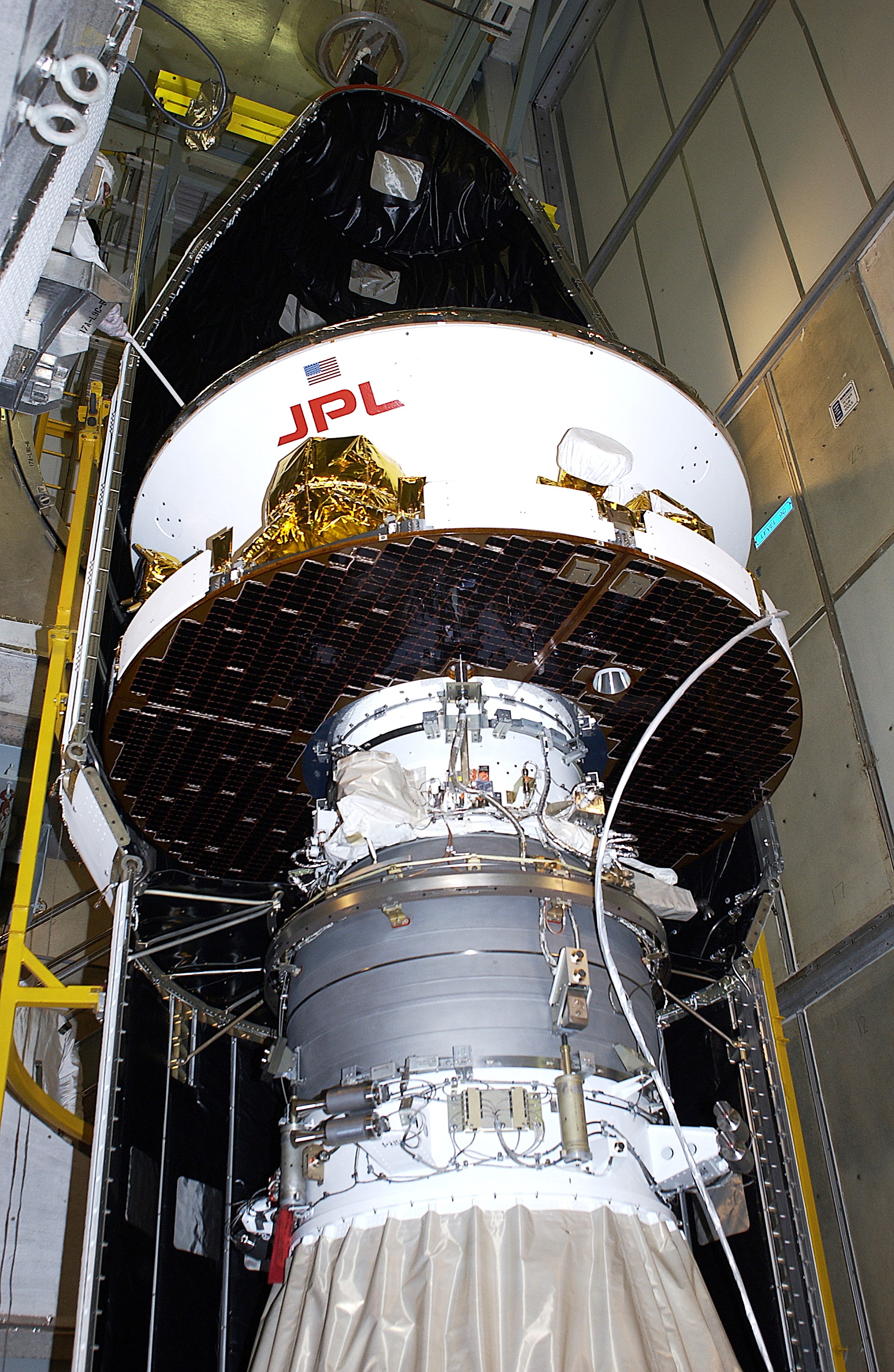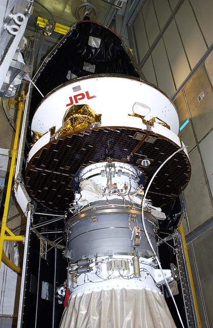 KENNEDY SPACE CENTER, FLA. - At Launch Complex 17-A, Cape Canaveral Air Force Station, the first half of the fairing for the Mars Exploration Rover 2 (MER-2) is installed around the Mars Exploration Rover 2 (MER-2). MER-2 is one of NASA's twin Mars Exploration Rovers designed to study the history of water on Mars. These robotic geologists are equipped with a robotic arm, a drilling tool, three spectrometers, and four pairs of cameras that allow them to have a human-like, 3D view of the terrain. Each rover could travel as far as 100 meters in one day to act as Mars scientists' eyes and hands, exploring an environment where humans can't yet go. MER-2 is scheduled to launch no earlier than June 8 as MER-A, with two launch opportunities each day during the launch period that closes on June 19.