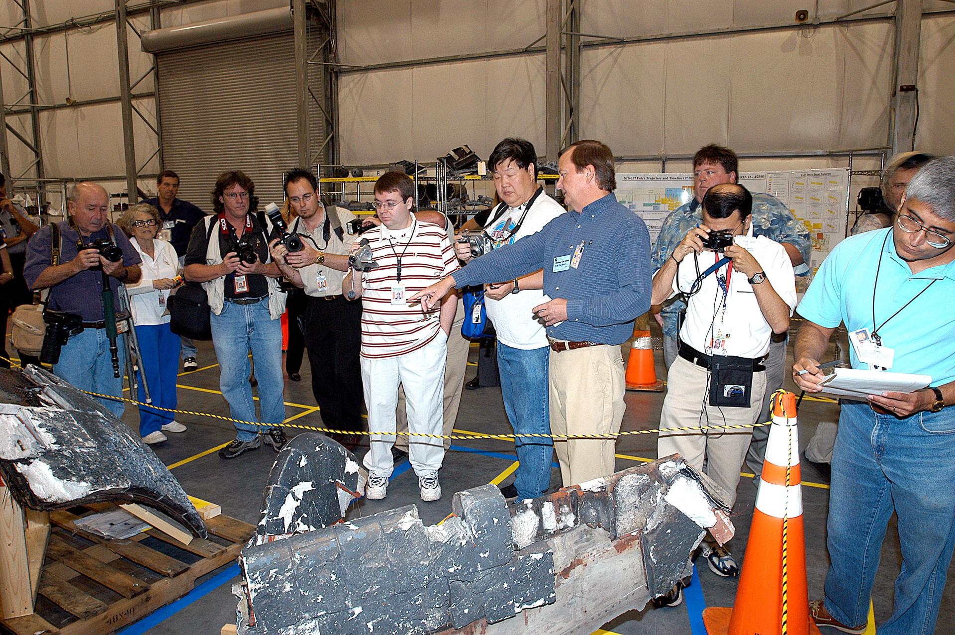 KENNEDY SPACE CENTER, FLA. - In the Columbia Debris Hangar, Shuttle Launch Director Mike Leinbach points to some of the debris as he explains to the media about activities that have taken place since the Columbia accident on Feb. 1, 2003. STS-107 debris recovery and reconstruction operations are winding down. To date, nearly 84,000 pieces of debris have been recovered and sent to KSC. That represents about 38 percent of the dry weight of Columbia, equaling almost 85,000 pounds.
