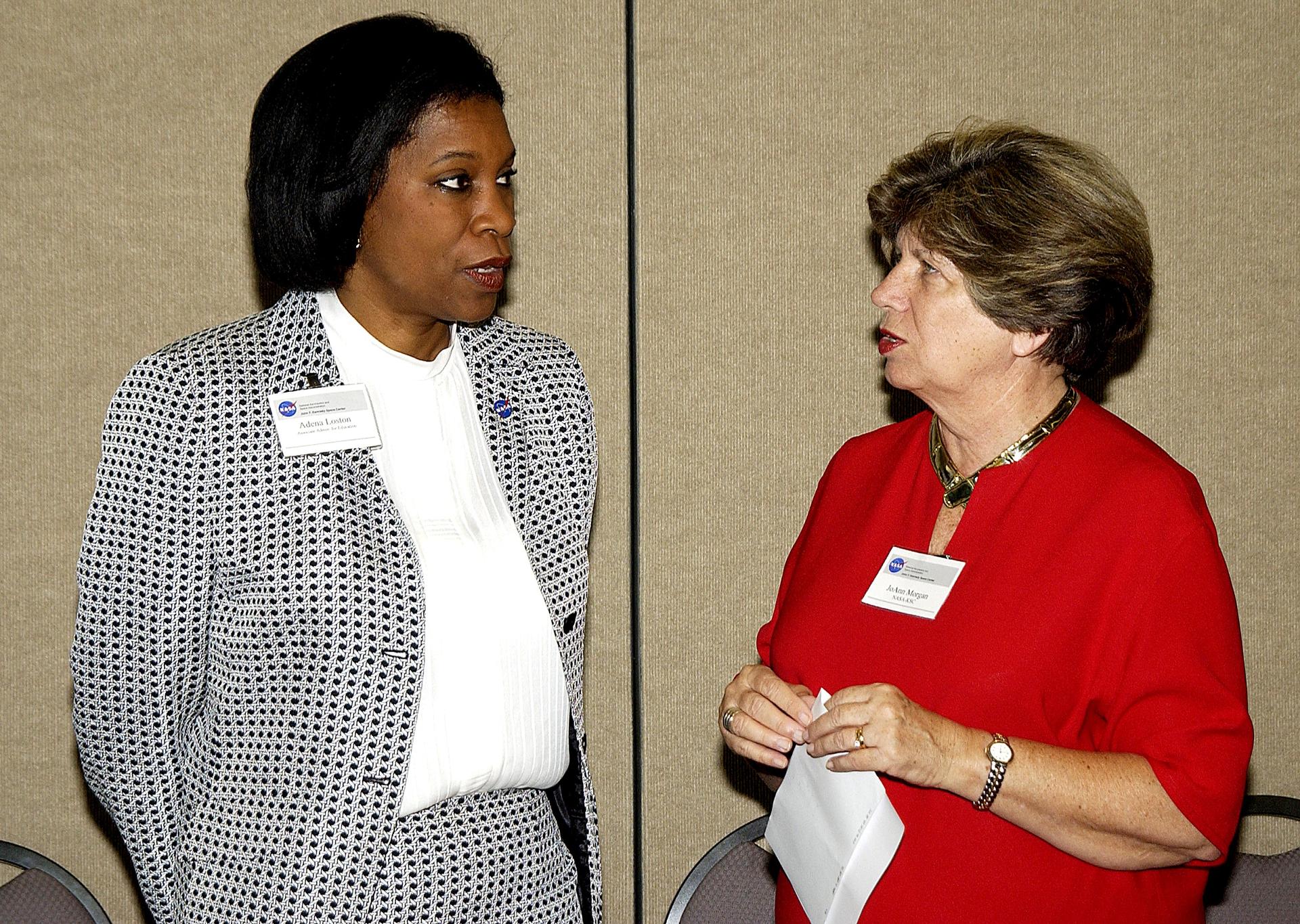 KENNEDY SPACE CENTER, FLA. - KSC Director of External Relations and Business Development JoAnn Morgan talks with Dr. Adena Williams Loston at a reception and dinner at the Debus Conference Center June 6. Loston is NASA’s new associate administrator of Education and the reception was in her honor. Loston was previously NASA Administrator Sean O’Keefe’s senior advisor of education and assumed her new position in October 2002. KSC Director Roy Bridges Jr. also attended the reception to welcome Loston during her visit to the Center.