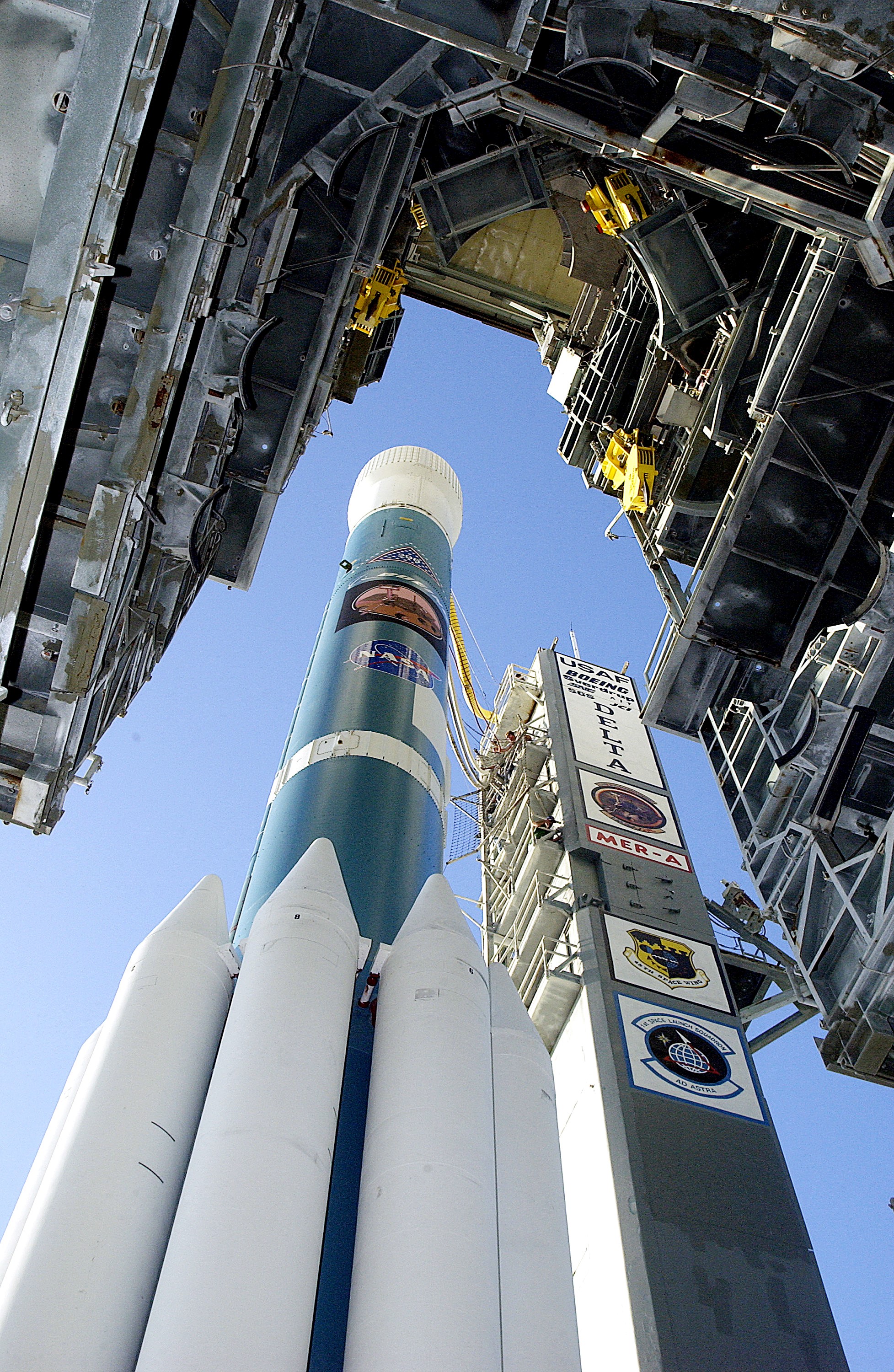 KENNEDY SPACE CENTER, FLA. - The Boeing Delta II rocket and its Mars Exploration Rover (MER-A) payload is viewed from under the launch tower as it moves away on Launch Complex 17-A, Cape Canaveral Air Force Station. This will be a second attempt at launch. The first attempt on June 8, 2003, was scrubbed due to bad weather in the vicinity. MER-A is the first of two rovers being launched to Mars. When the two rovers arrive at Mars in 2004, they will bounce to airbag-cushioned landings at sites offering a balance of favorable conditions for safe landings and interesting science. The rovers see sharper images, can explore farther and examine rocks better than anything that has ever landed on Mars. The designated site for MER-A mission is Gusev Crater, which appears to have been a crater lake. The second rover, MER-B, is scheduled to launch June 25.