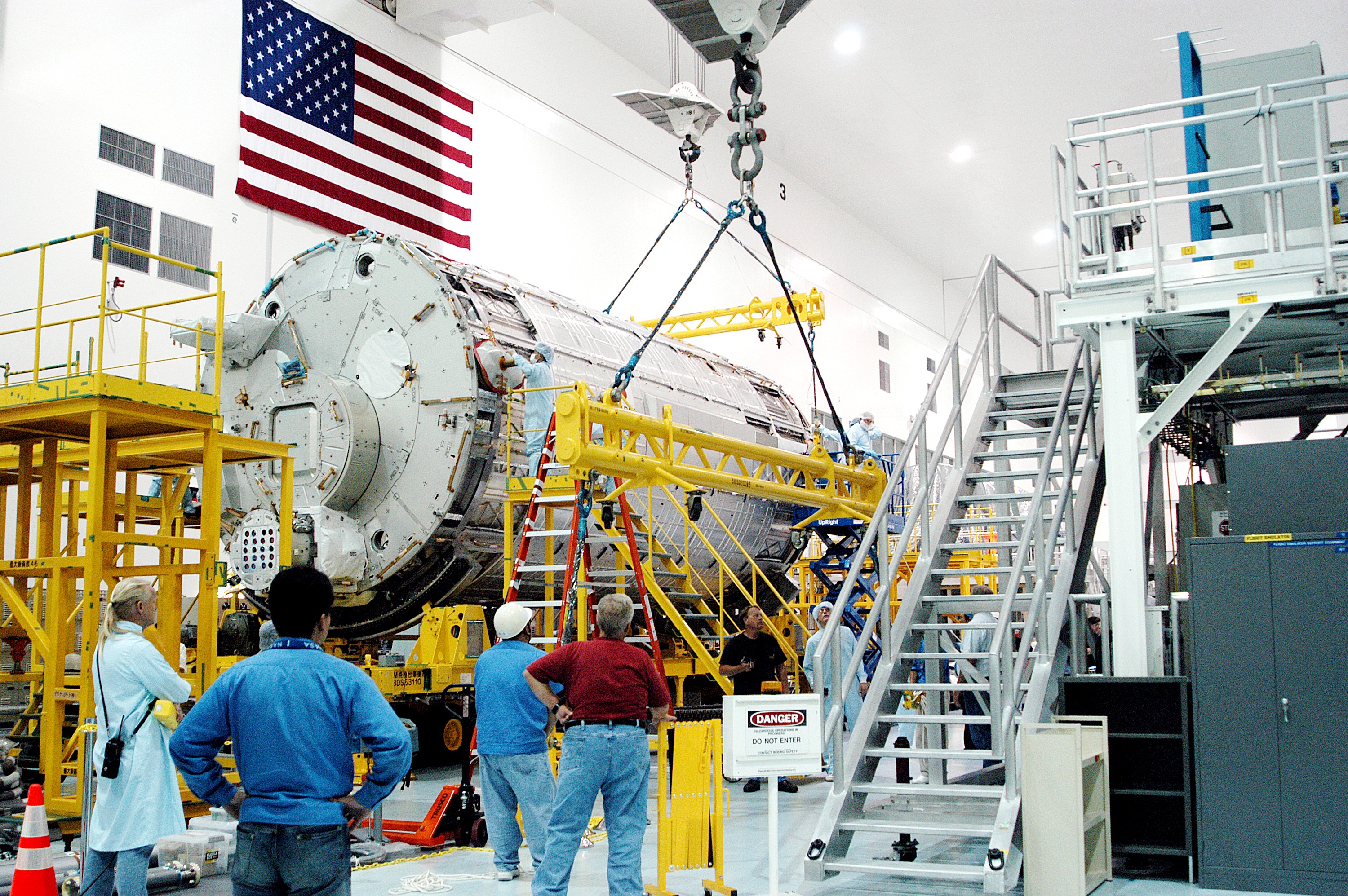 KENNEDY SPACE CENTER, FLA. - In the Space Station Processing Facility, overhead cranes are removed from the Japanese Experiment Module (JEM) pressure module now on its work stand. A research laboratory, the pressurized module is the first element of the JEM, named "Kibo" (Hope), to be delivered to KSC. The National Space Development Agency of Japan (NASDA) developed the laboratory at the Tsukuba Space Center near Tokyo and is Japan's primary contribution to the Station. It will enhance the unique research capabilities of the orbiting complex by providing an additional environment for astronauts to conduct science experiments. The JEM also includes an exposed facility (platform) for space environment experiments, a robotic manipulator system, and two logistics modules. The various JEM components will be assembled in space over the course of three Shuttle missions.