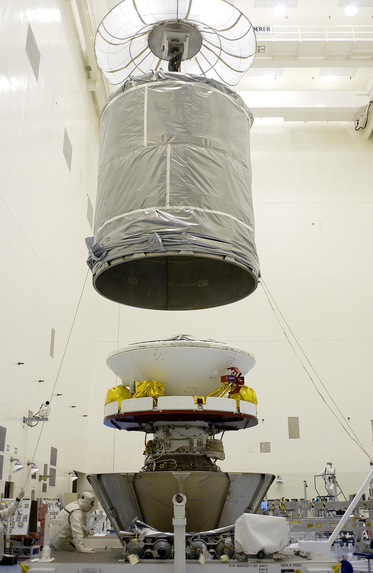 An overhead crane lowers the cylindrical payload canister toward Mars Exploration Rover 1 (MER-B). Once secure inside the canister, the rover will be transported to Launch Complex 17-B, Cape Canaveral Air Force Station, for mating with the Delta rocket. The second of twin rovers being sent to Mars, it is equipped with a robotic arm, a drilling tool, three spectrometers, and four pairs of cameras that allow it to have a human-like, 3D view of the terrain. Each rover could travel as far as 100 meters in one day to act as Mars scientists' eyes and hands, exploring an environment where humans can't yet go. MER-B is scheduled to launch from Pad 17-B June 26 at one of two available times, 12:27:31 a.m. EDT or 1:08:45 a.m. EDT.