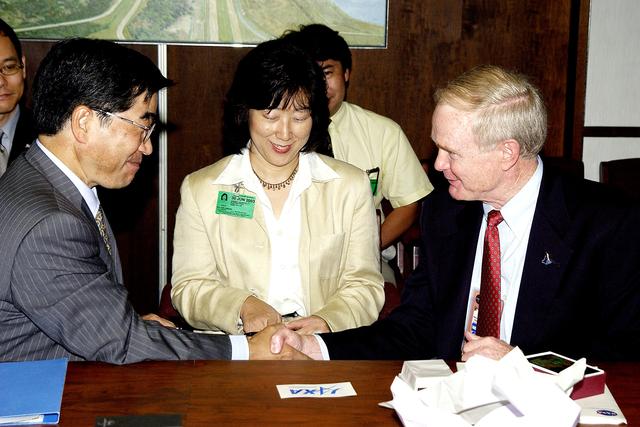 KENNEDY SPACE CENTER, FLA. - Executive Director of NASDA Koji Yamamoto (left) is welcomed to KSC by Center Director Roy Bridges Jr. (right). On the table between them is the logo of the new Japan Aerospace Exploration Agency, a merger of three Japanese aeronautical and space agencies effective Oct.1, 2003. Mr. Yamamoto is at KSC for a welcome ceremony involving the arrival of the newest Space Station module, the Japanese Experiment Module/pressurized module. His visit includes a tour of the Columbia Debris Hangar.