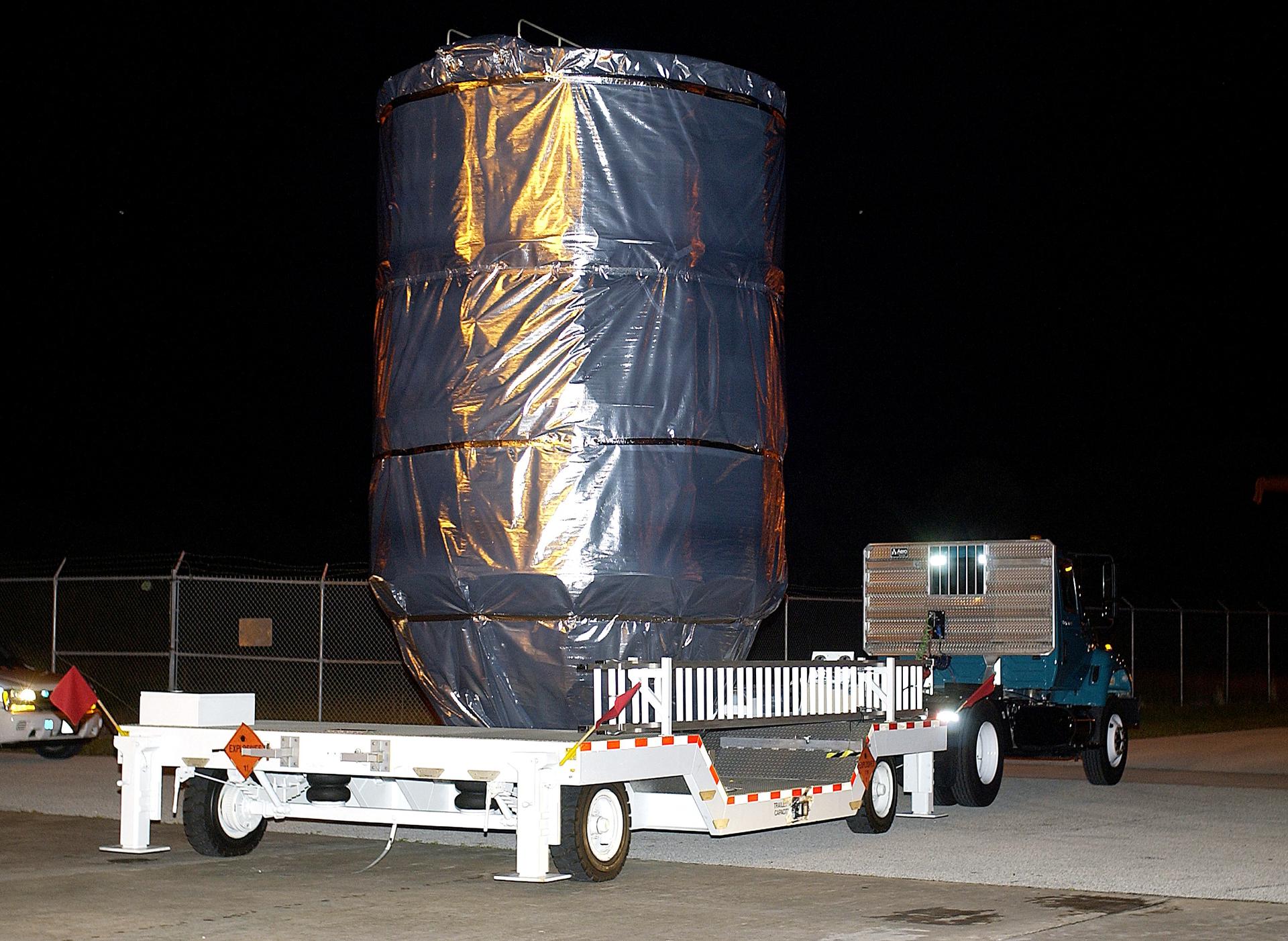 KENNEDY SPACE CENTER, FLA. - The Mars Exploration Rover 1 (MER-B) is moved out of the Payload Hazardous Servicing Facility for transfer to Launch Pad 17-B, Cape Canaveral Air Force Station. The second of twin rovers being sent to Mars, it is equipped with a robotic arm, a drilling tool, three spectrometers, and four pairs of cameras that allow it to have a human-like, 3D view of the terrain. Each rover could travel as far as 100 meters in one day to act as Mars scientists' eyes and hands, exploring an environment where humans can't yet go. MER-B is scheduled to launch June 26 at one of two available times, 12:27:31 a.m. EDT or 1:08:45 a.m. EDT.