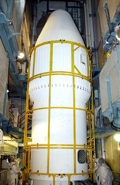 KENNEDY SPACE CENTER, FLA. - At Launch Complex 17-B, Cape Canaveral Air Force Station, workers complete the installation of the spacecraft fairing around the Mars Exploration Rover-1 (MER-B) for launch. The second of twin rovers being sent to Mars, it is equipped with a robotic arm, a drilling tool, three spectrometers, and four pairs of cameras that allow it to have a human-like, 3D view of the terrain. Each rover could travel as far as 100 meters in one day to act as Mars scientists' eyes and hands, exploring an environment where humans are not yet able to go. MER-B is scheduled to launch no earlier than June 28 at one of two available times, 11:56:16 p.m. EDT or 12:37:59 a.m. EDT.